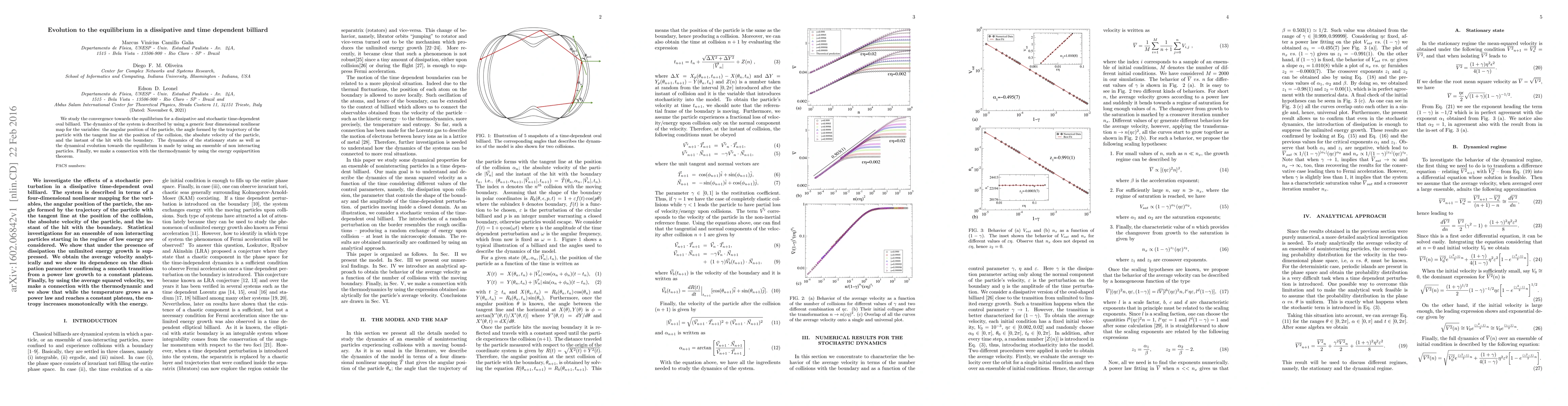 This paper investigates the convergence of a dissipative, stochastic time-dependent oval billiard system towards equilibrium, employing a four-dimensional nonlinear map to describe particle dynamics, and connects the system's stationary state to thermodynamic principles via the energy equipartition theorem.