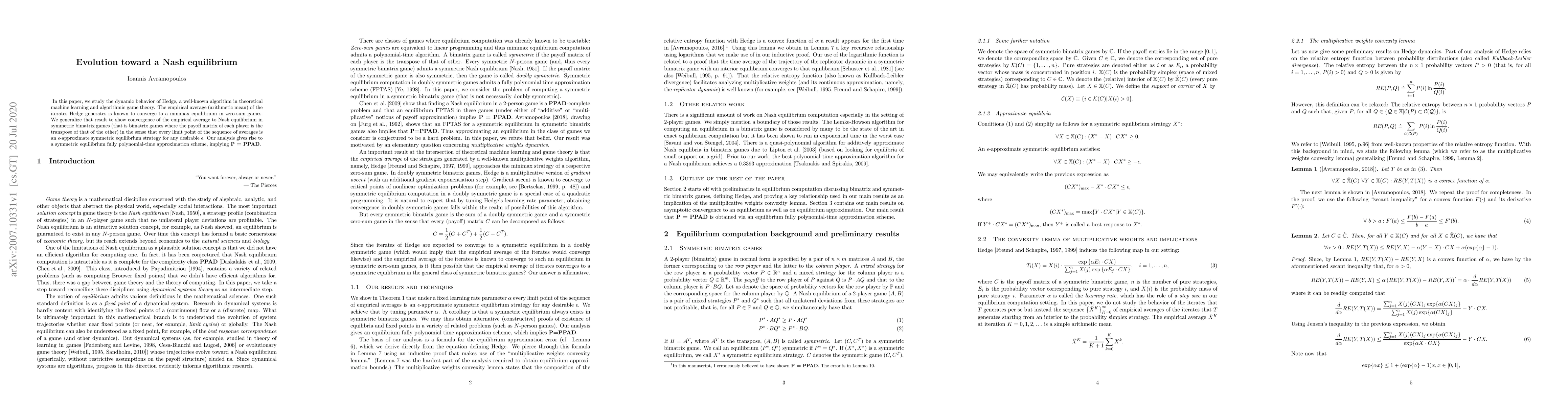 In this paper, we study the dynamic behavior of Hedge, a well-known algorithm in theoretical machine learning and algorithmic game theory. The empirical average (arithmetic mean) of the iterates Hedge generates is known to converge to a minimax equilibrium in zero-sum games. We generalize that result to show convergence of the empirical average to Nash equilibrium in symmetric bimatrix games (that is bimatrix games where the payoff matrix of each player is the transpose of that of the other) in the sense that every limit point of the sequence of averages is an $\epsilon$-approximate symmetric equilibrium strategy for any desirable $\epsilon$. Our analysis gives rise to a symmetric equilibrium fully polynomial-time approximation scheme, implying P = PPAD.