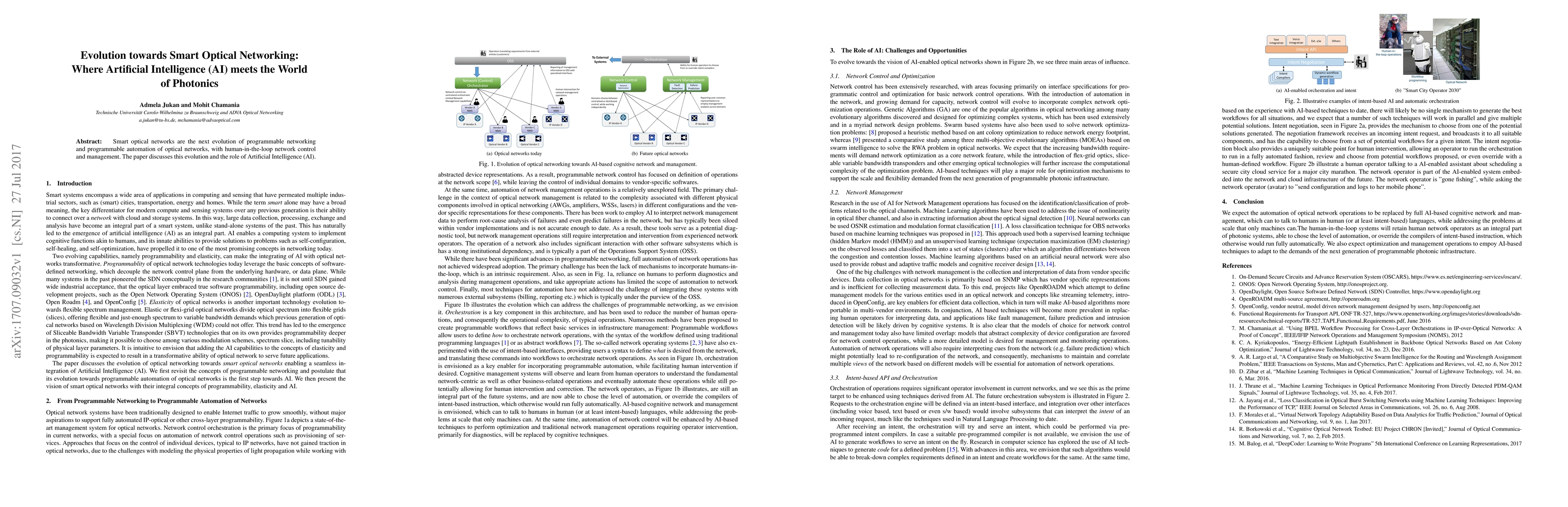 Summary: This paper explores the evolution of smart optical networks, emphasizing the integration of Artificial Intelligence (AI) to enhance programmable automation and human-in-the-loop control, marking a significant advancement in photonics and network management.