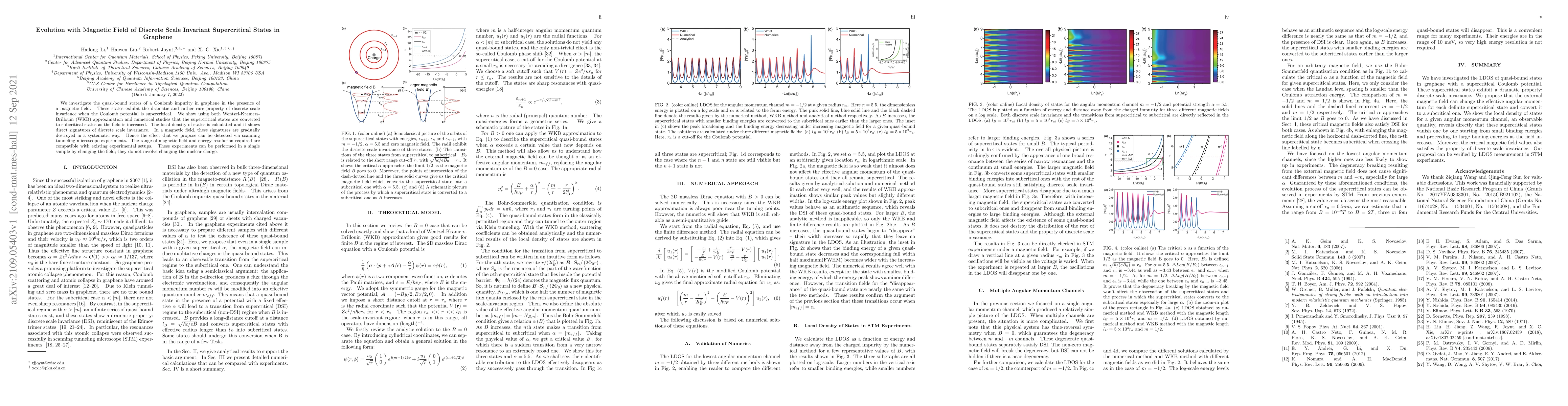 This paper explores quasi-bound states in graphene under a magnetic field, revealing discrete scale invariant properties in supercritical Coulomb potential states. Both theoretical and numerical methods show that increasing the magnetic field converts these states to subcritical ones, with detectable signatures via scanning tunneling microscopy.