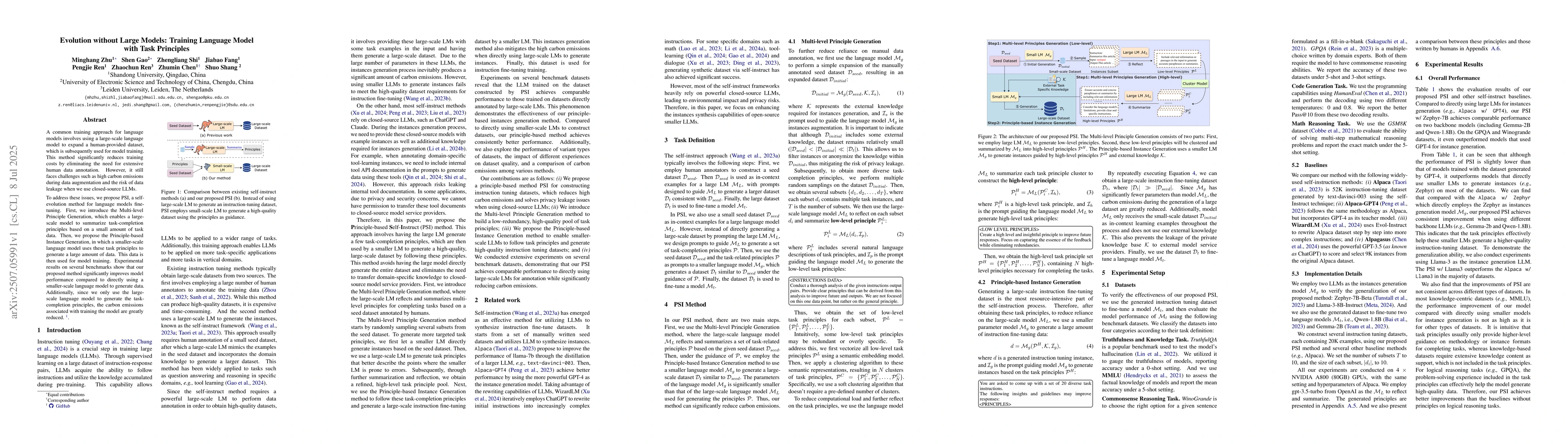 A common training approach for language models involves using a large-scale language model to expand a human-provided dataset, which is subsequently used for model training.This method significantly reduces training costs by eliminating the need for extensive human data annotation. However, it still faces challenges such as high carbon emissions during data augmentation and the risk of data leakage when we use closed-source LLMs. To address these issues, we propose a self-evolution method for language models. First, we introduce the Multi-level Principle Generation, which enables a large-scale model to summarize task-completion principles based on a small amount of task data. Then, we propose the Principle-based Instance Generation, in which a smaller-scale language model uses these task principles to generate a large amount of data. This data is then used for model training. Experimental results show that our proposed method significantly improves model performance compared to directly using a smaller-scale language model to generate data. Additionally, since we only use the large-scale language model to generate the task-completion principles, the carbon emissions associated with training the model are greatly reduced.
