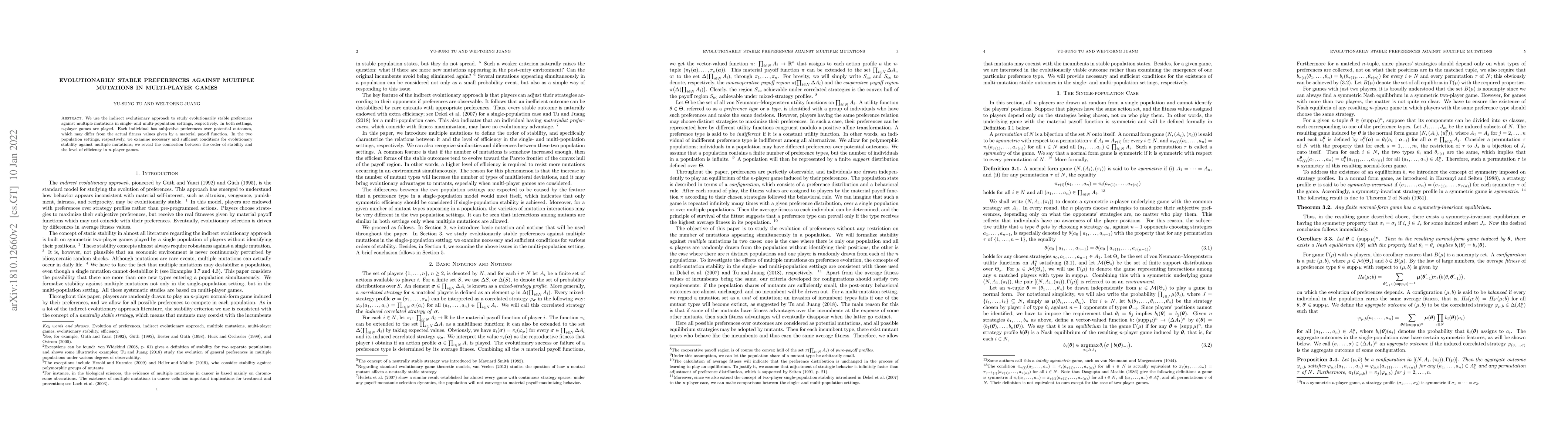 We use the indirect evolutionary approach to study evolutionarily stable preferences against multiple mutations in single- and multi-population settings, respectively. In both settings, n-player games are played. Each individual has subjective preferences over potential outcomes, which may differ from the actual fitness values given by a material payoff function. In the two population settings, respectively, we examine necessary and sufficient conditions for evolutionary stability against multiple mutations; we reveal the connection between the order of stability and the level of efficiency in $n$-player games.