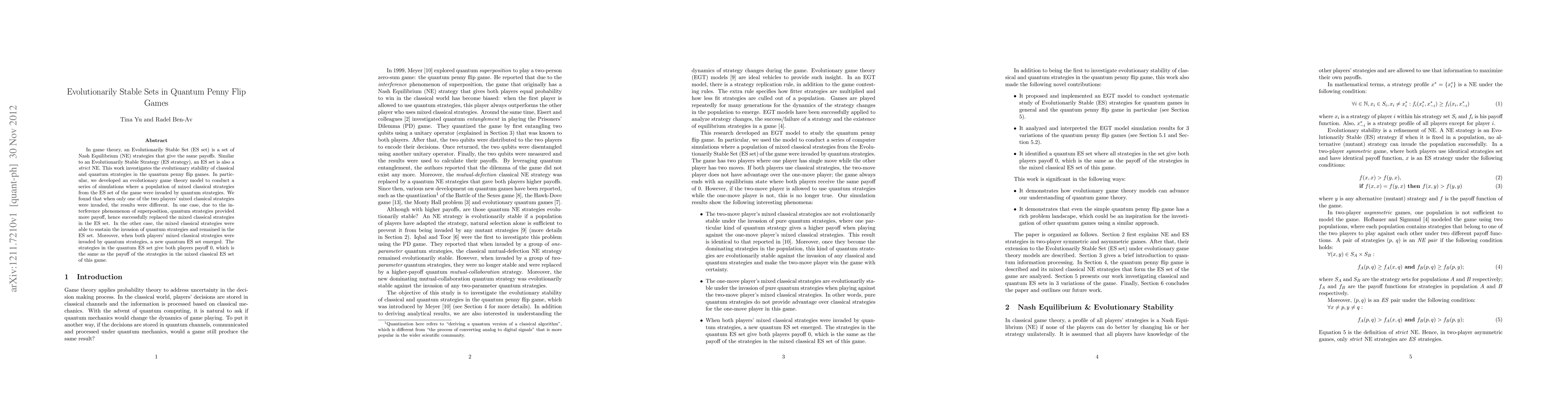 This paper explores the evolutionary stability of classical and quantum strategies in quantum penny flip games using an evolutionary game theory model. It finds that quantum strategies can replace classical strategies due to superposition interference, but classical strategies can also sustain invasion, and a new quantum ES set emerges when both players are invaded, yielding zero payoffs.