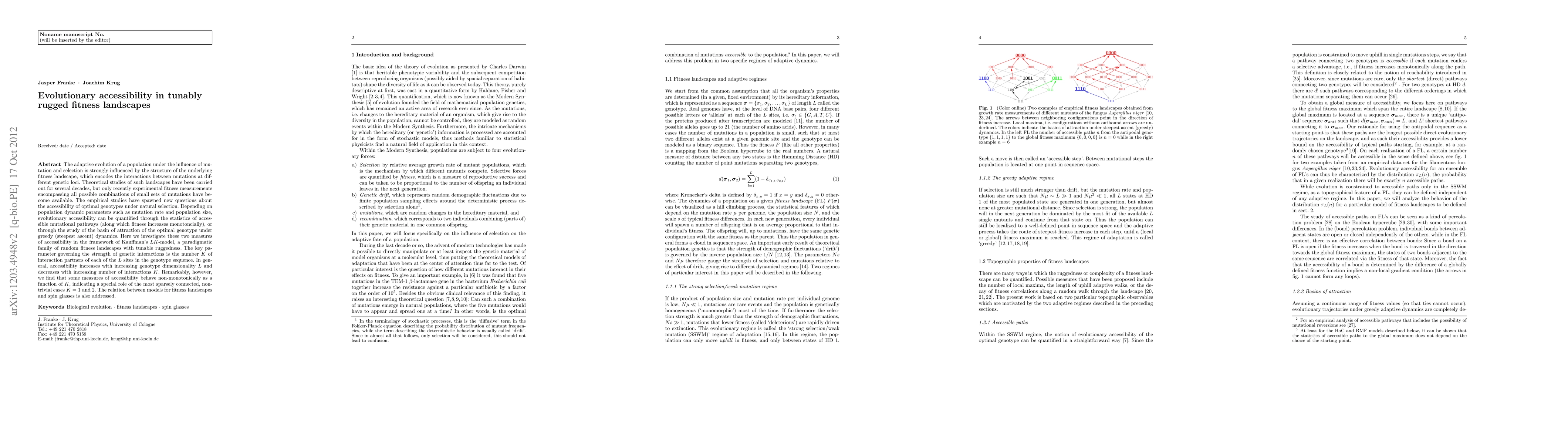 The research investigates evolutionary accessibility in fitness landscapes derived from Kaufmann's LK model, quantifying accessibility through topographic properties in strong selection/weak mutation and greedy regimes.