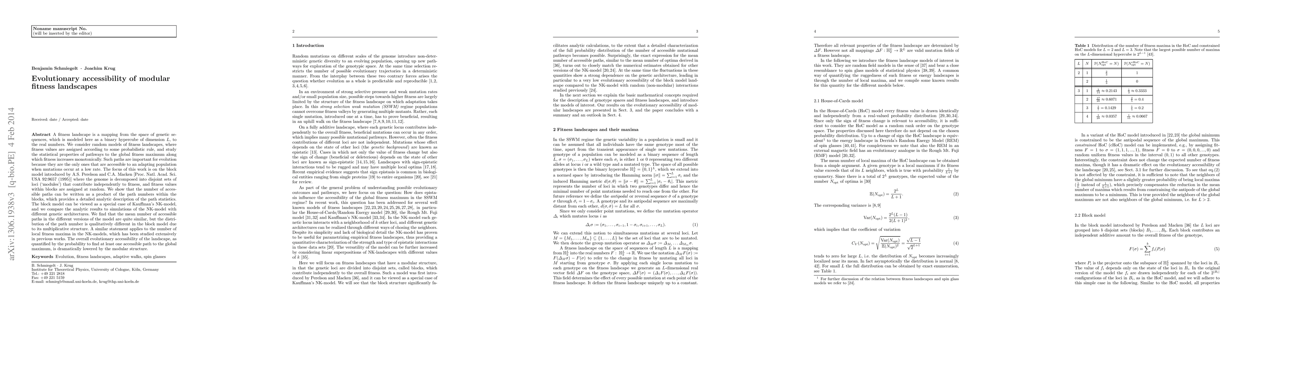 A fitness landscape is a mapping from the space of genetic sequences, which is modeled here as a binary hypercube of dimension $L$, to the real numbers. We consider random models of fitness landscapes, where fitness values are assigned according to some probabilistic rule, and study the statistical properties of pathways to the global fitness maximum along which fitness increases monotonically. Such paths are important for evolution because they are the only ones that are accessible to an adapting population when mutations occur at a low rate. The focus of this work is on the block model introduced by A.S. Perelson and C.A. Macken [Proc. Natl. Acad. Sci. USA 92:9657 (1995)] where the genome is decomposed into disjoint sets of loci (`modules') that contribute independently to fitness, and fitness values within blocks are assigned at random. We show that the number of accessible paths can be written as a product of the path numbers within the blocks, which provides a detailed analytic description of the path statistics. The block model can be viewed as a special case of Kauffman's NK-model, and we compare the analytic results to simulations of the NK-model with different genetic architectures. We find that the mean number of accessible paths in the different versions of the model are quite similar, but the distribution of the path number is qualitatively different in the block model due to its multiplicative structure. A similar statement applies to the number of local fitness maxima in the NK-models, which has been studied extensively in previous works. The overall evolutionary accessibility of the landscape, as quantified by the probability to find at least one accessible path to the global maximum, is dramatically lowered by the modular structure.