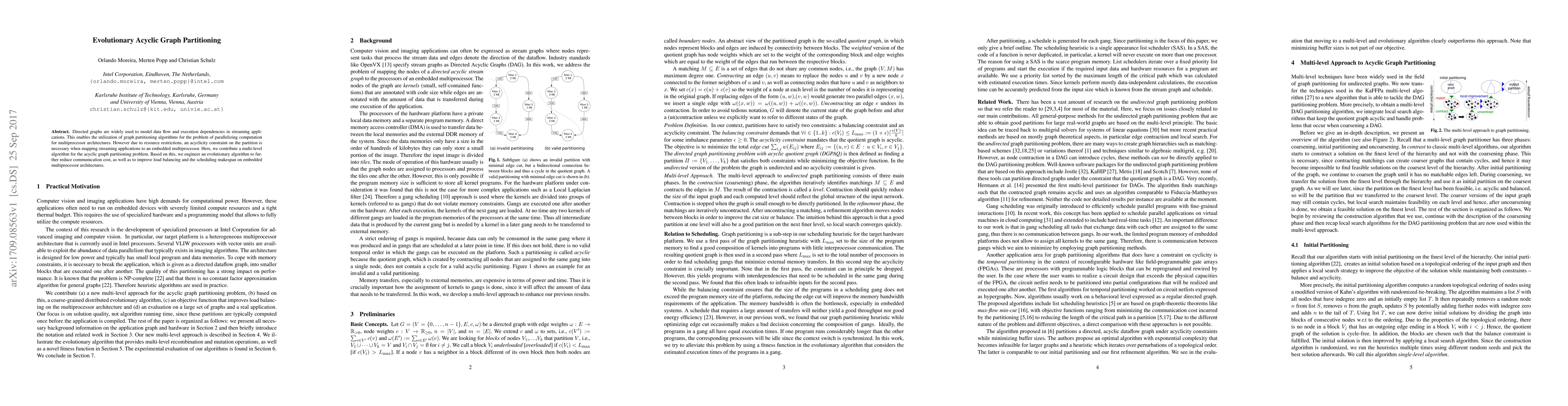 This paper proposes a multi-level algorithm for partitioning acyclic directed graphs to parallelize computation in streaming applications for multiprocessor architectures. An evolutionary algorithm is also developed to minimize communication costs, enhance load balancing, and reduce scheduling makespan on embedded systems.