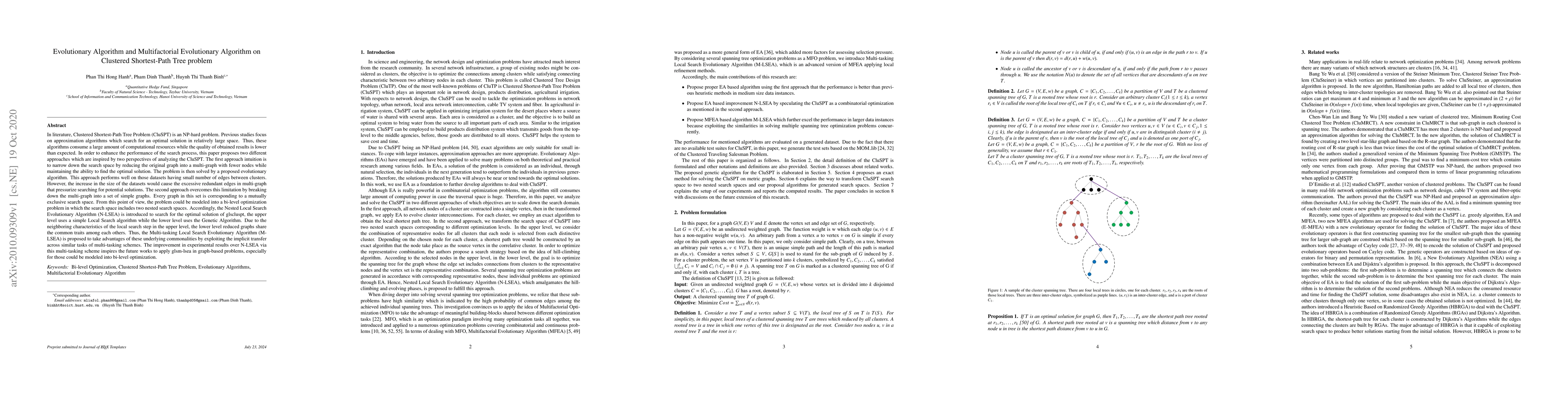 In literature, Clustered Shortest-Path Tree Problem (CluSPT) is an NP-hard problem. Previous studies often search for an optimal solution in relatively large space. To enhance the performance of the search process, two approaches are proposed: the first approach seeks for solutions as a set of edges. From the original graph, we generate a new graph whose vertex set's cardinality is much smaller than that of the original one. Consequently, an effective Evolutionary Algorithm (EA) is proposed for solving CluSPT. The second approach looks for vertex-based solutions. The search space of the CluSPT is transformed into 2 nested search spaces (NSS). With every candidate in the high-level optimization, the search engine in the lower level will find a corresponding candidate to combine with it to create the best solution for CluSPT. Accordingly, Nested Local Search EA (N-LSEA) is introduced to search for the optimal solution on the NSS. When solving this model in lower level by N-LSEA, variety of similar tasks are handled. Thus, Multifactorial Evolutionary Algorithm applied in order to enhance the implicit genetic transfer across these optimizations. Proposed algorithms are conducted on a series of datasets and the obtained results demonstrate superior efficiency in comparison to previous scientific works.