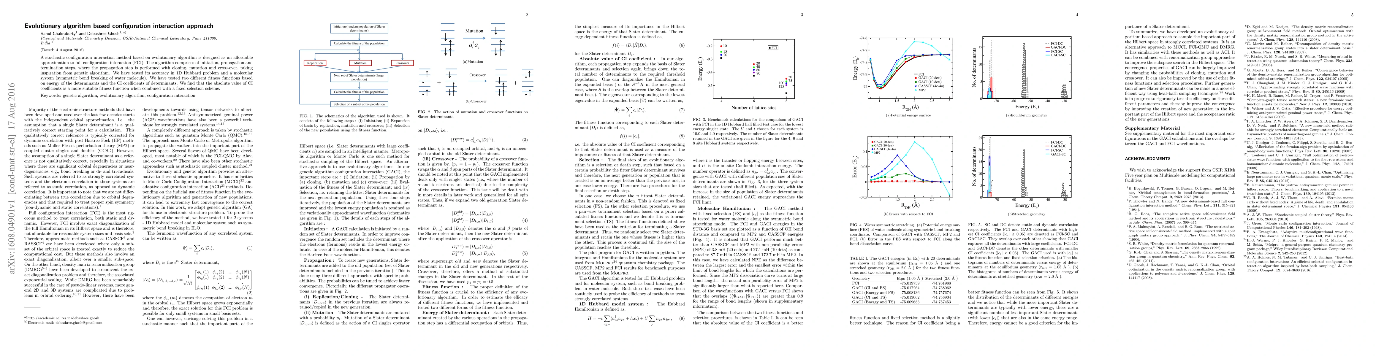 This paper proposes an evolutionary algorithm-based configuration interaction method as a cost-effective alternative to full configuration interaction. The algorithm uses cloning, mutation, and crossover to propagate configurations, and it was tested on the 1D Hubbard model and a water molecule system, showing better accuracy with CI coefficients as the fitness function.