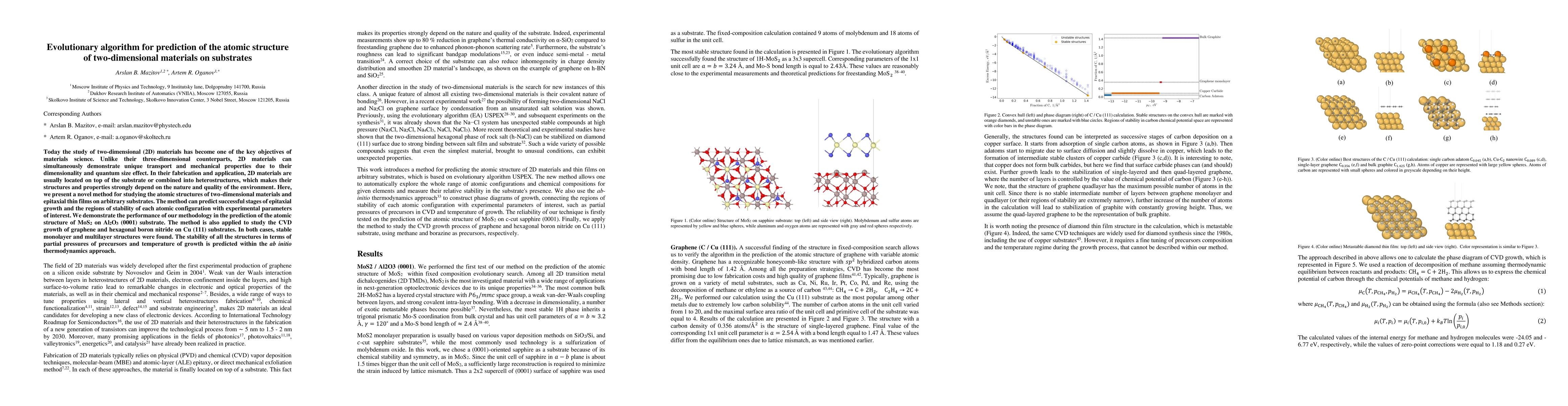 This paper introduces an evolutionary algorithm to predict the atomic structures of two-dimensional materials on substrates, demonstrating its effectiveness in predicting stable configurations for MoS2 on Al2O3 and graphene and hexagonal boron nitride on Cu substrates, using ab initio thermodynamics.