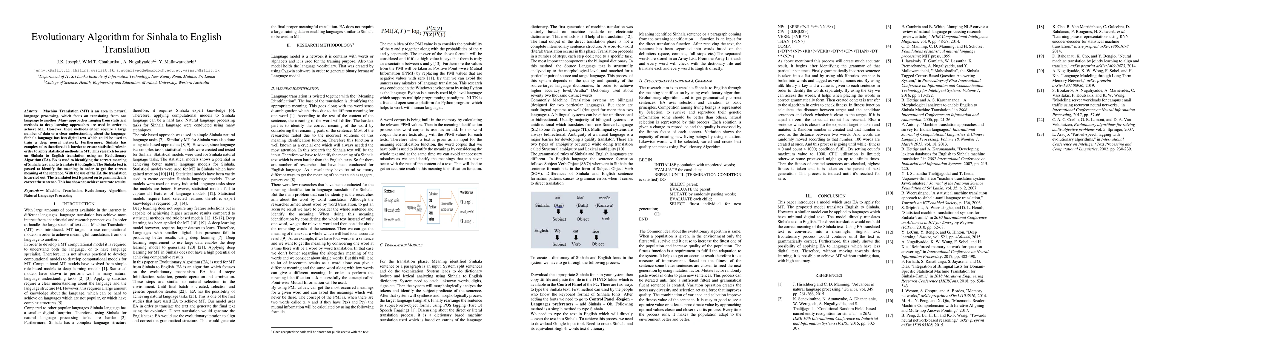 Machine Translation (MT) is an area in natural language processing, which focus on translating from one language to another. Many approaches ranging from statistical methods to deep learning approaches are used in order to achieve MT. However, these methods either require a large number of data or a clear understanding about the language. Sinhala language has less digital text which could be used to train a deep neural network. Furthermore, Sinhala has complex rules therefore, it is harder to create statistical rules in order to apply statistical methods in MT. This research focuses on Sinhala to English translation using an Evolutionary Algorithm (EA). EA is used to identifying the correct meaning of Sinhala text and to translate it to English. The Sinhala text is passed to identify the meaning in order to get the correct meaning of the sentence. With the use of the EA the translation is carried out. The translated text is passed on to grammatically correct the sentence. This has shown to achieve accurate results.