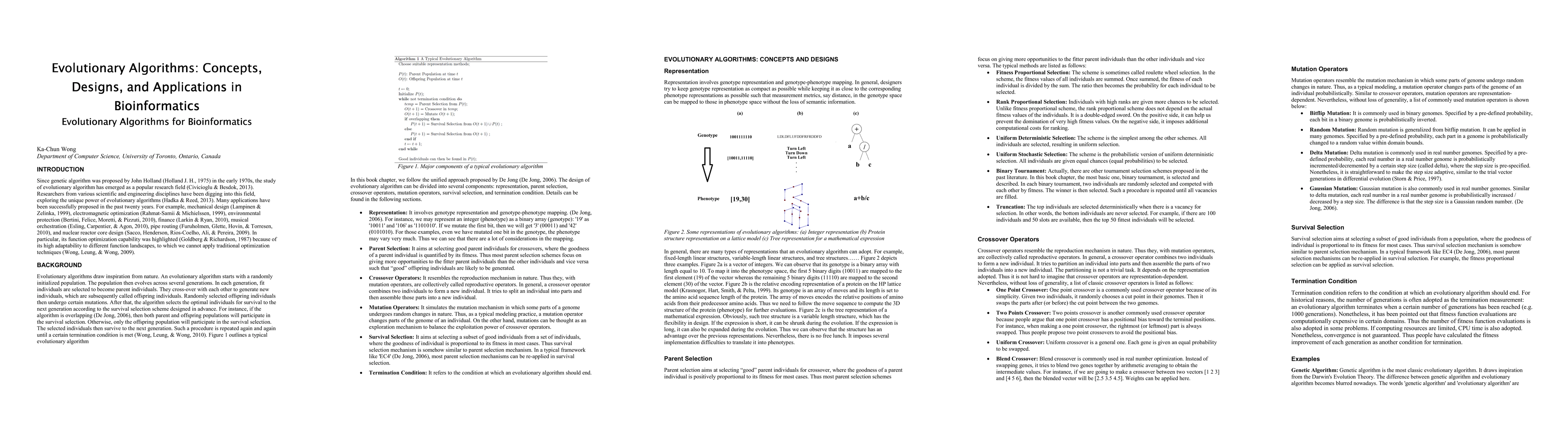 Since genetic algorithm was proposed by John Holland (Holland J. H., 1975) in the early 1970s, the study of evolutionary algorithm has emerged as a popular research field (Civicioglu & Besdok, 2013). Researchers from various scientific and engineering disciplines have been digging into this field, exploring the unique power of evolutionary algorithms (Hadka & Reed, 2013). Many applications have been successfully proposed in the past twenty years. For example, mechanical design (Lampinen & Zelinka, 1999), electromagnetic optimization (Rahmat-Samii & Michielssen, 1999), environmental protection (Bertini, Felice, Moretti, & Pizzuti, 2010), finance (Larkin & Ryan, 2010), musical orchestration (Esling, Carpentier, & Agon, 2010), pipe routing (Furuholmen, Glette, Hovin, & Torresen, 2010), and nuclear reactor core design (Sacco, Henderson, Rios-Coelho, Ali, & Pereira, 2009). In particular, its function optimization capability was highlighted (Goldberg & Richardson, 1987) because of its high adaptability to different function landscapes, to which we cannot apply traditional optimization techniques (Wong, Leung, & Wong, 2009). Here we review the applications of evolutionary algorithms in bioinformatics.