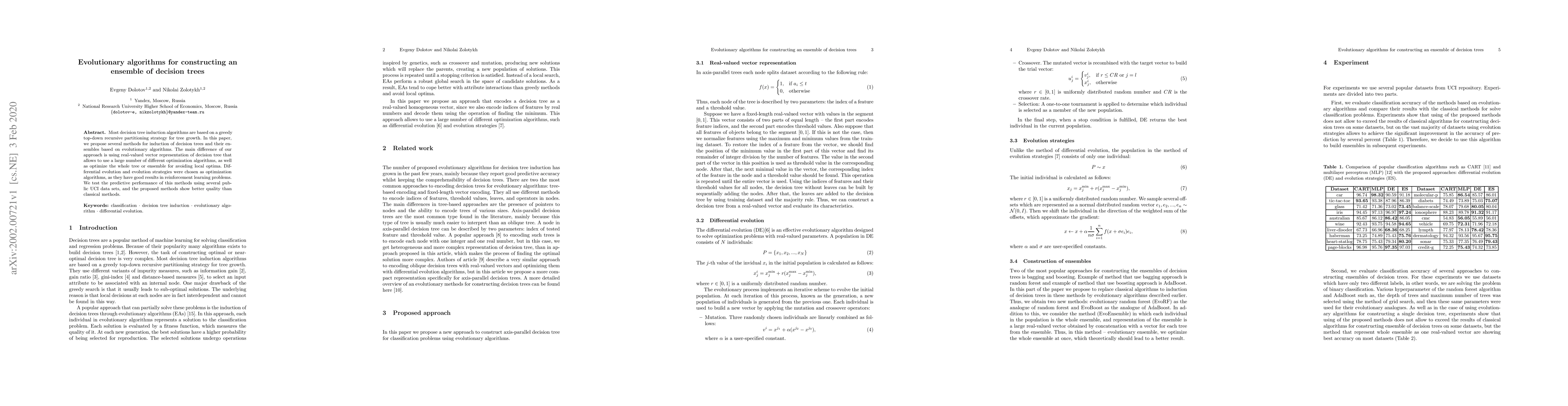 This paper proposes evolutionary algorithms for constructing ensembles of decision trees, using real-valued vector representations to optimize the whole tree or ensemble. Differential evolution and evolution strategies are employed, showing improved predictive performance over classical methods on public UCI datasets.