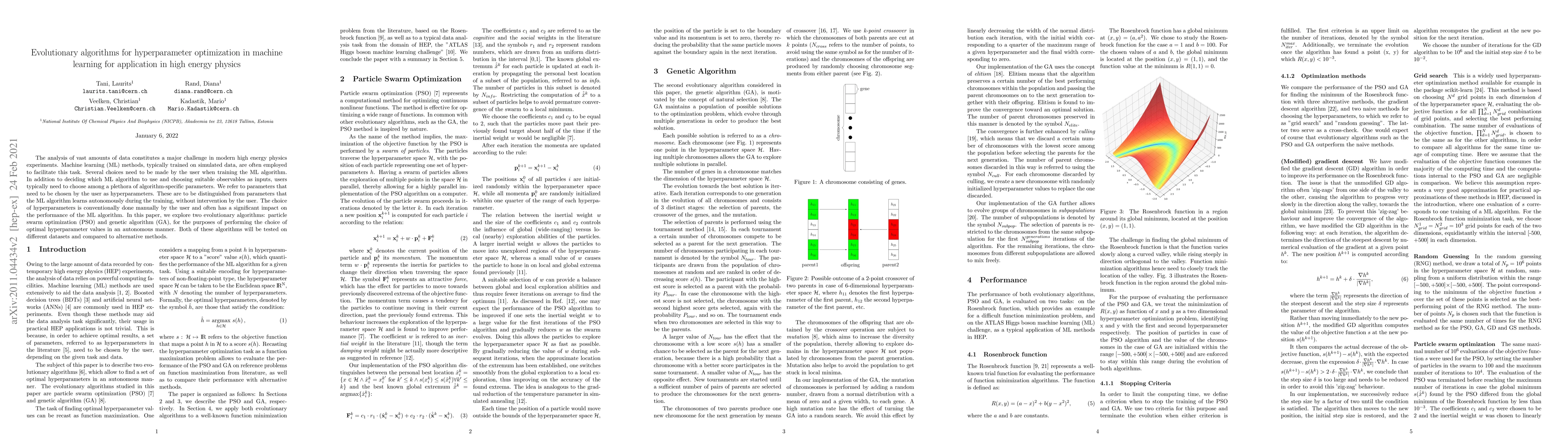 The analysis of vast amounts of data constitutes a major challenge in modern high energy physics experiments. Machine learning (ML) methods, typically trained on simulated data, are often employed to facilitate this task. Several choices need to be made by the user when training the ML algorithm. In addition to deciding which ML algorithm to use and choosing suitable observables as inputs, users typically need to choose among a plethora of algorithm-specific parameters. We refer to parameters that need to be chosen by the user as hyperparameters. These are to be distinguished from parameters that the ML algorithm learns autonomously during the training, without intervention by the user. The choice of hyperparameters is conventionally done manually by the user and often has a significant impact on the performance of the ML algorithm. In this paper, we explore two evolutionary algorithms: particle swarm optimization (PSO) and genetic algorithm (GA), for the purposes of performing the choice of optimal hyperparameter values in an autonomous manner. Both of these algorithms will be tested on different datasets and compared to alternative methods.