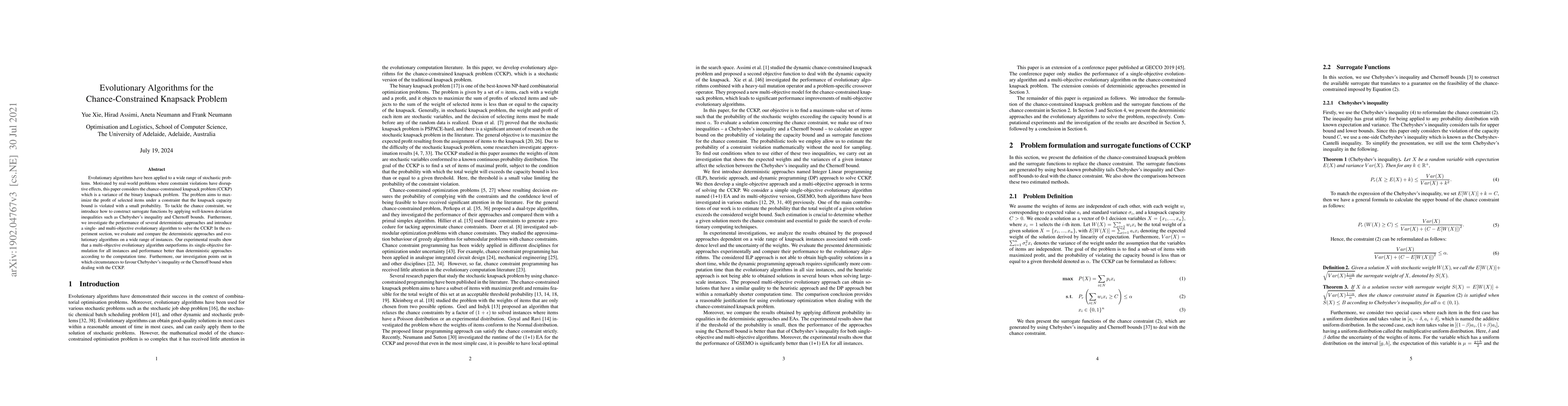 This paper explores evolutionary algorithms for solving the chance-constrained knapsack problem (CCKP), introducing surrogate functions based on Chebyshev's inequality and Chernoff bounds. Experimental results show that a multi-objective evolutionary algorithm outperforms single-objective and deterministic approaches, especially in terms of computation time.