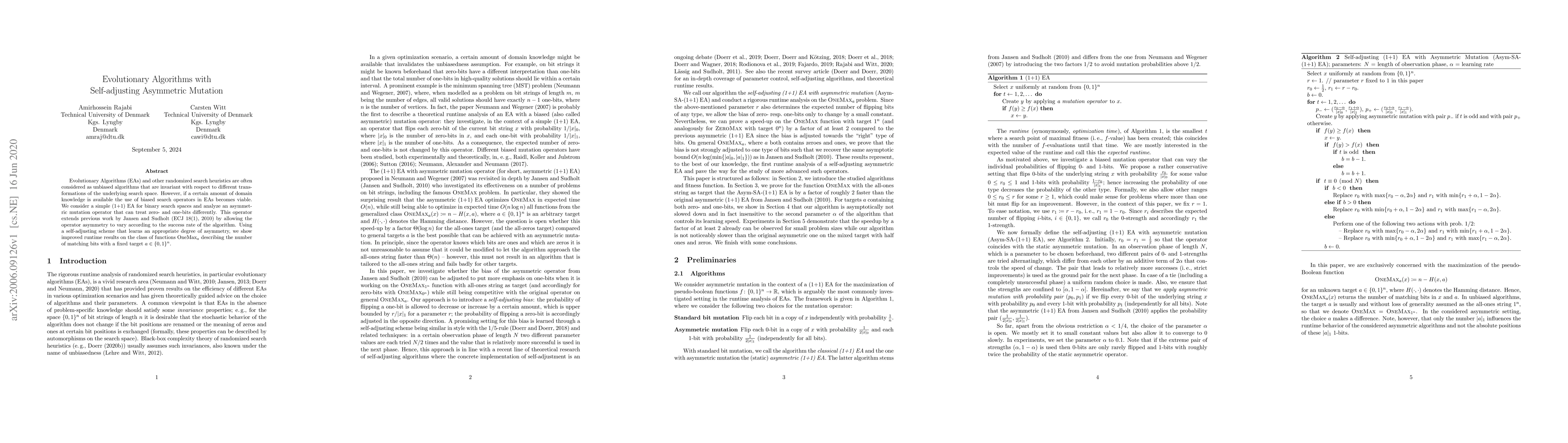 This paper proposes an evolutionary algorithm with a self-adjusting asymmetric mutation operator that dynamically adjusts its bias based on the algorithm's success rate, leading to improved performance on OneMax$_a$ functions compared to traditional unbiased algorithms. The study extends previous work by incorporating a learning mechanism to optimize the degree of asymmetry.