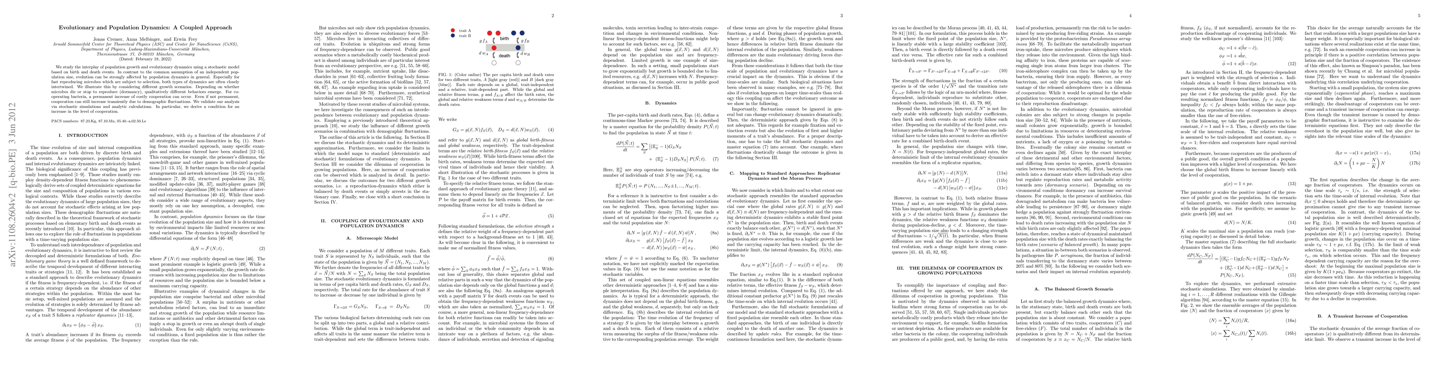 This paper explores the interaction between population growth and evolutionary dynamics through a stochastic model, demonstrating that population dynamics can significantly influence evolution, especially in fast-reproducing microbes. It highlights how different growth scenarios, such as dormancy versus death, lead to varying behaviors, including transient or permanent increases in cooperation among bacteria, validated through simulations and analytical calculations.