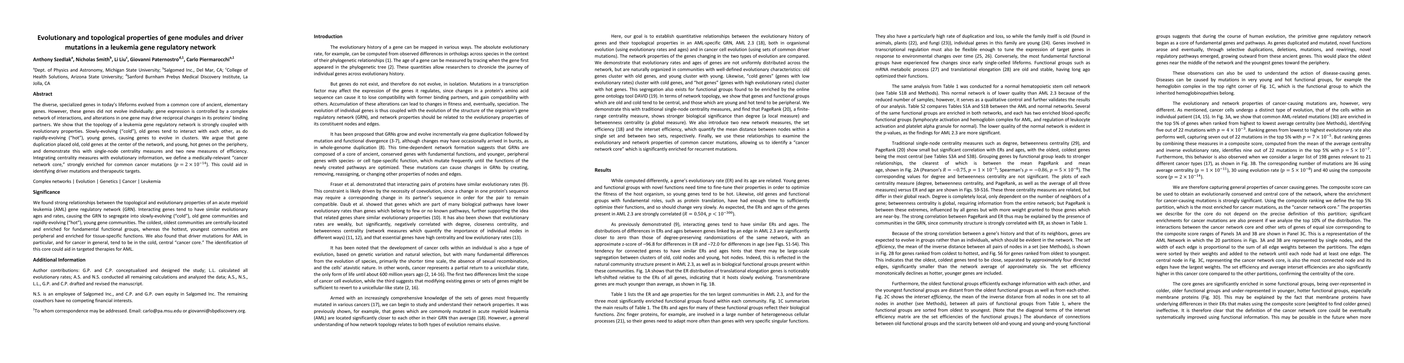 This study reveals that the topology of a leukemia gene regulatory network is linked to evolutionary properties, with old, slowly-evolving genes forming central clusters and young, rapidly-evolving genes on the periphery. The identified "cancer network core" is enriched for common cancer mutations, potentially aiding in the identification of driver mutations and therapeutic targets.