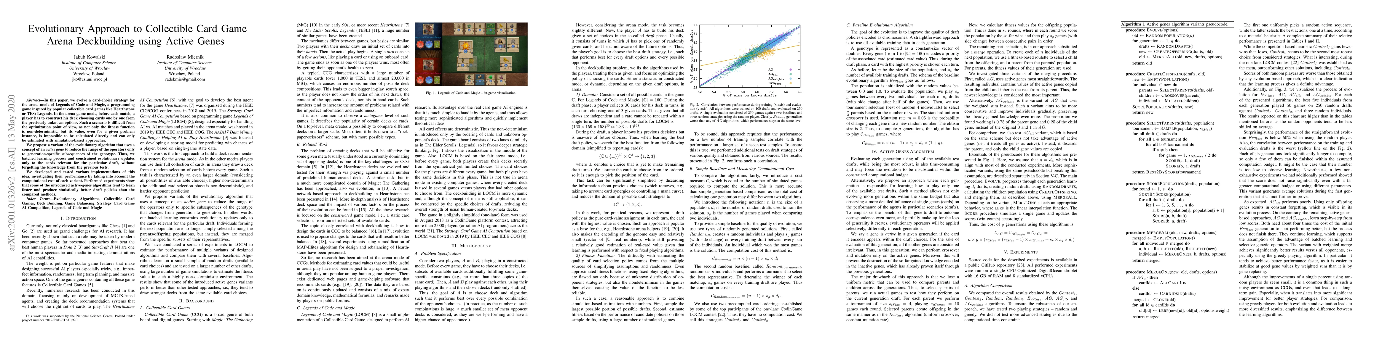 This paper proposes an evolutionary algorithm using active genes to optimize deckbuilding strategies in the arena mode of Legends of Code and Magic, a programming game. The method focuses on relevant cards for each draft, speeding up learning and improving performance compared to traditional methods.