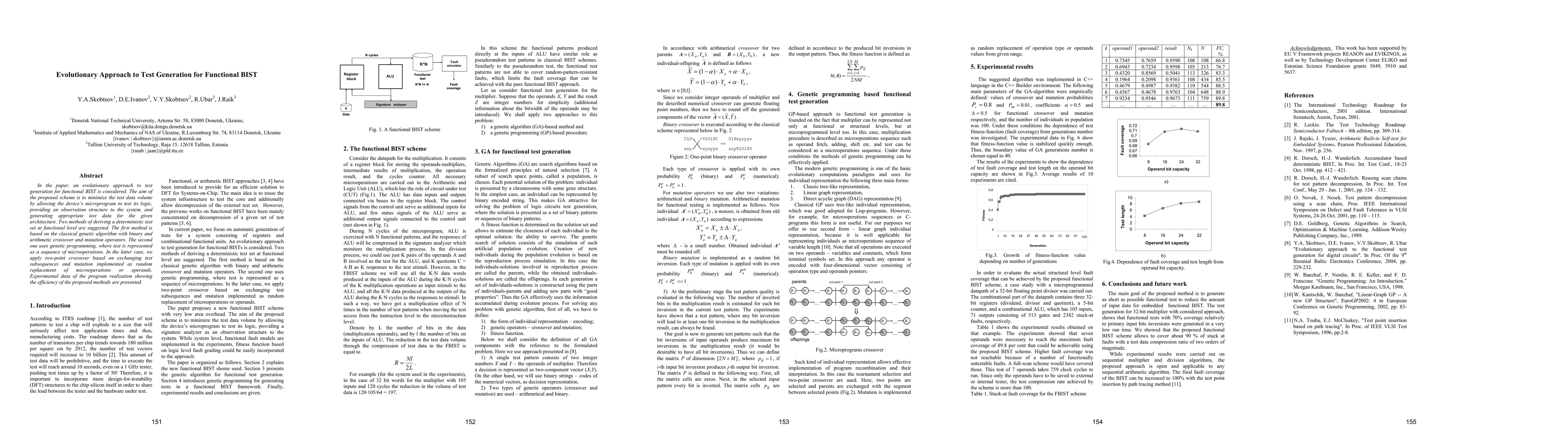In the paper, an evolutionary approach to test generation for functional BIST is considered. The aim of the proposed scheme is to minimize the test data volume by allowing the device's microprogram to test its logic, providing an observation structure to the system, and generating appropriate test data for the given architecture. Two methods of deriving a deterministic test set at functional level are suggested. The first method is based on the classical genetic algorithm with binary and arithmetic crossover and mutation operators. The second one uses genetic programming, where test is represented as a sequence of microoperations. In the latter case, we apply two-point crossover based on exchanging test subsequences and mutation implemented as random replacement of microoperations or operands. Experimental data of the program realization showing the efficiency of the proposed methods are presented.