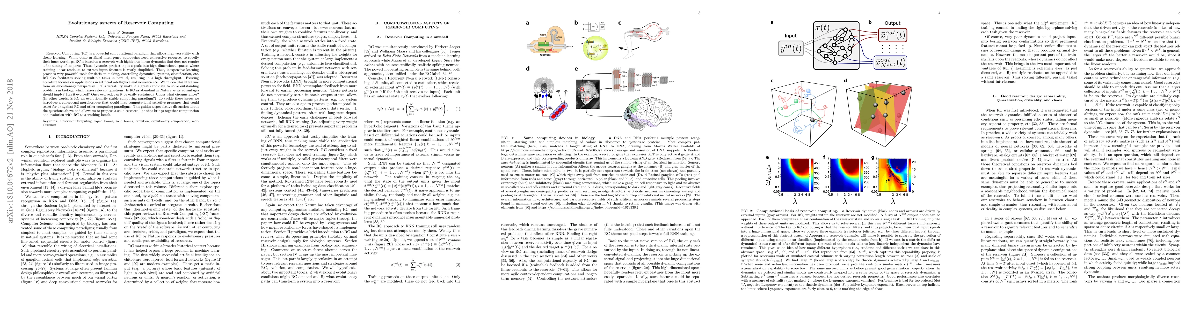 Reservoir Computing (RC) is a powerful computational paradigm that allows high versatility with cheap learning. While other artificial intelligence approaches need exhaustive resources to specify their inner workings, RC is based on a reservoir with highly non-linear dynamics that does not require a fine tuning of its parts. These dynamics project input signals into high-dimensional spaces, where training linear readouts to extract input features is vastly simplified. Thus, inexpensive learning provides very powerful tools for decision making, controlling dynamical systems, classification, etc. RC also facilitates solving multiple tasks in parallel, resulting in a high throughput. Existing literature focuses on applications in artificial intelligence and neuroscience. We review this literature from an evolutionary perspective. RC's versatility make it a great candidate to solve outstanding problems in biology, which raises relevant questions: Is RC as abundant in Nature as its advantages should imply? Has it evolved? Once evolved, can it be easily sustained? Under what circumstances? (In other words, is RC an evolutionarily stable computing paradigm?) To tackle these issues we introduce a conceptual morphospace that would map computational selective pressures that could select for or against RC and other computing paradigms. This guides a speculative discussion about the questions above and allows us to propose a solid research line that brings together computation and evolution with RC as a working bench.