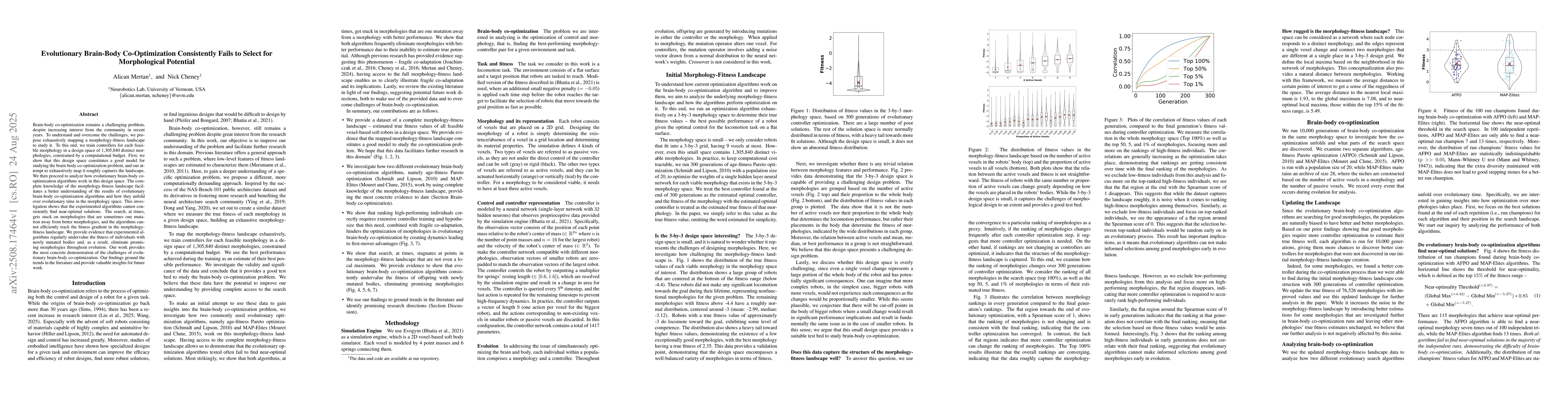 Brain-body co-optimization remains a challenging problem, despite increasing interest from the community in recent years. To understand and overcome the challenges, we propose exhaustively mapping a morphology-fitness landscape to study it. To this end, we train controllers for each feasible morphology in a design space of 1,305,840 distinct morphologies, constrained by a computational budget. First, we show that this design space constitutes a good model for studying the brain-body co-optimization problem, and our attempt to exhaustively map it roughly captures the landscape. We then proceed to analyze how evolutionary brain-body co-optimization algorithms work in this design space. The complete knowledge of the morphology-fitness landscape facilitates a better understanding of the results of evolutionary brain-body co-optimization algorithms and how they unfold over evolutionary time in the morphology space. This investigation shows that the experimented algorithms cannot consistently find near-optimal solutions. The search, at times, gets stuck on morphologies that are sometimes one mutation away from better morphologies, and the algorithms cannot efficiently track the fitness gradient in the morphology-fitness landscape. We provide evidence that experimented algorithms regularly undervalue the fitness of individuals with newly mutated bodies and, as a result, eliminate promising morphologies throughout evolution. Our work provides the most concrete demonstration of the challenges of evolutionary brain-body co-optimization. Our findings ground the trends in the literature and provide valuable insights for future work.