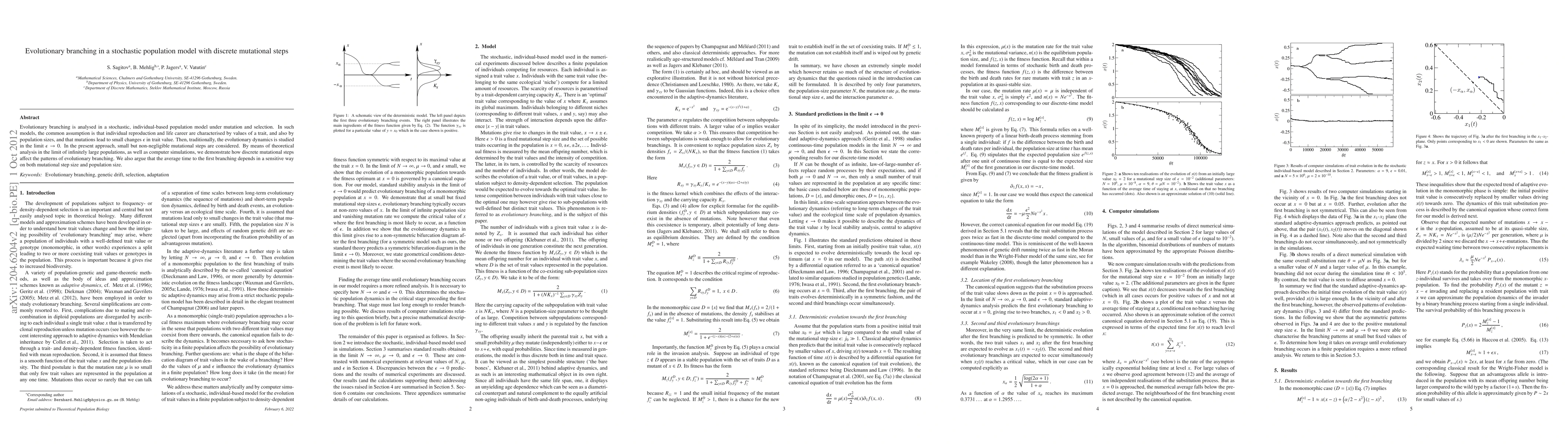 This paper investigates evolutionary branching in a stochastic population model where mutations occur in discrete steps rather than infinitesimally small changes. Theoretical analysis and simulations reveal that discrete mutations significantly influence branching patterns and the time to first branching, which is sensitive to both mutational step size and population size.