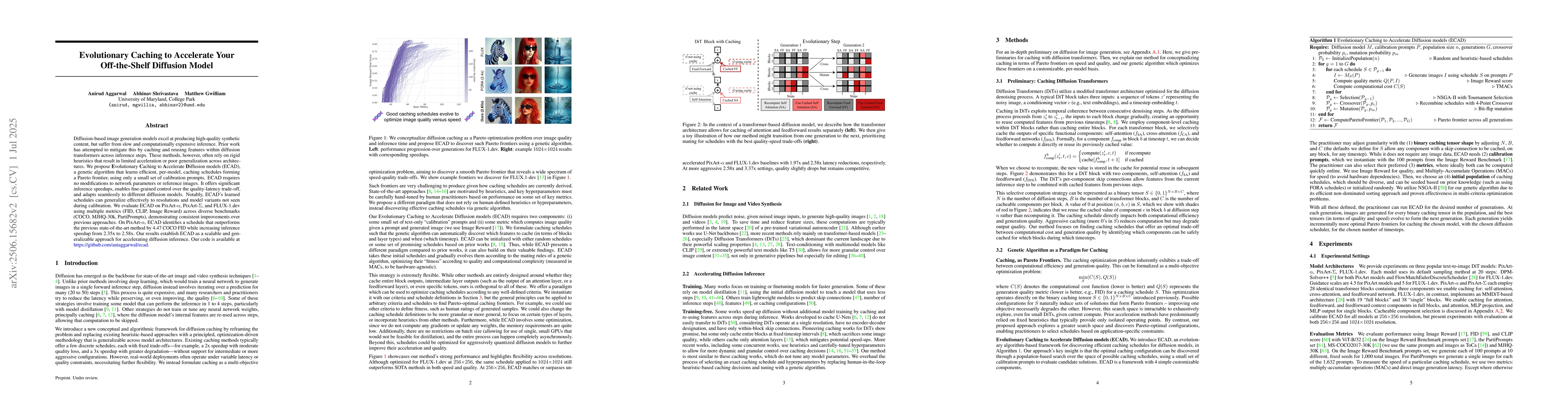 Diffusion-based image generation models excel at producing high-quality synthetic content, but suffer from slow and computationally expensive inference. Prior work has attempted to mitigate this by caching and reusing features within diffusion transformers across inference steps. These methods, however, often rely on rigid heuristics that result in limited acceleration or poor generalization across architectures. We propose Evolutionary Caching to Accelerate Diffusion models (ECAD), a genetic algorithm that learns efficient, per-model, caching schedules forming a Pareto frontier, using only a small set of calibration prompts. ECAD requires no modifications to network parameters or reference images. It offers significant inference speedups, enables fine-grained control over the quality-latency trade-off, and adapts seamlessly to different diffusion models. Notably, ECAD's learned schedules can generalize effectively to resolutions and model variants not seen during calibration. We evaluate ECAD on PixArt-alpha, PixArt-Sigma, and FLUX-1.dev using multiple metrics (FID, CLIP, Image Reward) across diverse benchmarks (COCO, MJHQ-30k, PartiPrompts), demonstrating consistent improvements over previous approaches. On PixArt-alpha, ECAD identifies a schedule that outperforms the previous state-of-the-art method by 4.47 COCO FID while increasing inference speedup from 2.35x to 2.58x. Our results establish ECAD as a scalable and generalizable approach for accelerating diffusion inference. Our project website is available at https://aniaggarwal.github.io/ecad and our code is available at https://github.com/aniaggarwal/ecad.
