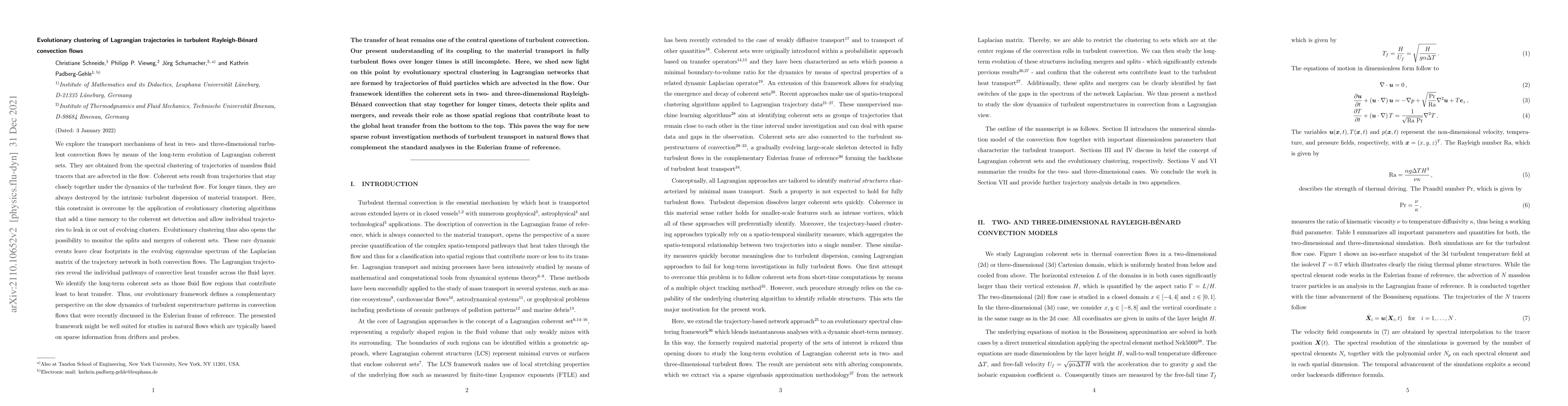 We explore the transport mechanisms of heat in two- and three-dimensional turbulent convection flows by means of the long-term evolution of Lagrangian coherent sets. They are obtained from the spectral clustering of trajectories of massless fluid tracers that are advected in the flow. Coherent sets result from trajectories that stay closely together under the dynamics of the turbulent flow. For longer times, they are always destroyed by the intrinsic turbulent dispersion of material transport. Here, this constraint is overcome by the application of evolutionary clustering algorithms that add a time memory to the coherent set detection and allow individual trajectories to leak in or out of evolving clusters. Evolutionary clustering thus also opens the possibility to monitor the splits and mergers of coherent sets. These rare dynamic events leave clear footprints in the evolving eigenvalue spectrum of the Laplacian matrix of the trajectory network in both convection flows. The Lagrangian trajectories reveal the individual pathways of convective heat transfer across the fluid layer. We identify the long-term coherent sets as those fluid flow regions that contribute least to heat transfer. Thus, our evolutionary framework defines a complementary perspective on the slow dynamics of turbulent superstructure patterns in convection flows that were recently discussed in the Eulerian frame of reference. The presented framework might be well suited for studies in natural flows which are typically based on sparse information from drifters and probes.