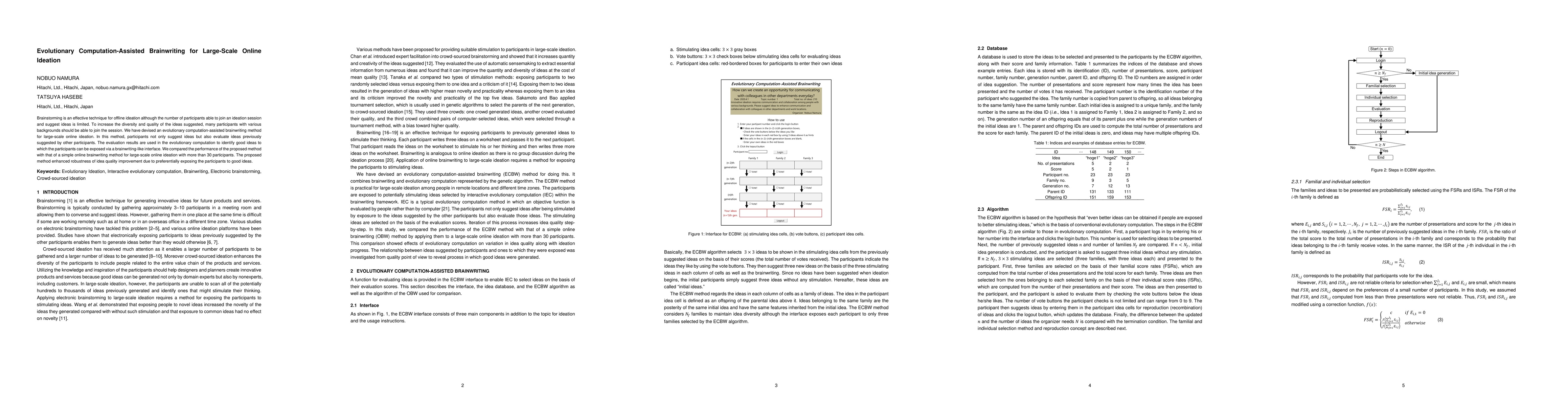 This paper proposes an evolutionary computation-assisted brainwriting method for large-scale online ideation, where participants suggest and evaluate ideas, and the method uses evaluations to highlight high-quality ideas. Compared to a simple online brainwriting method, this approach shows improved robustness in idea quality improvement.