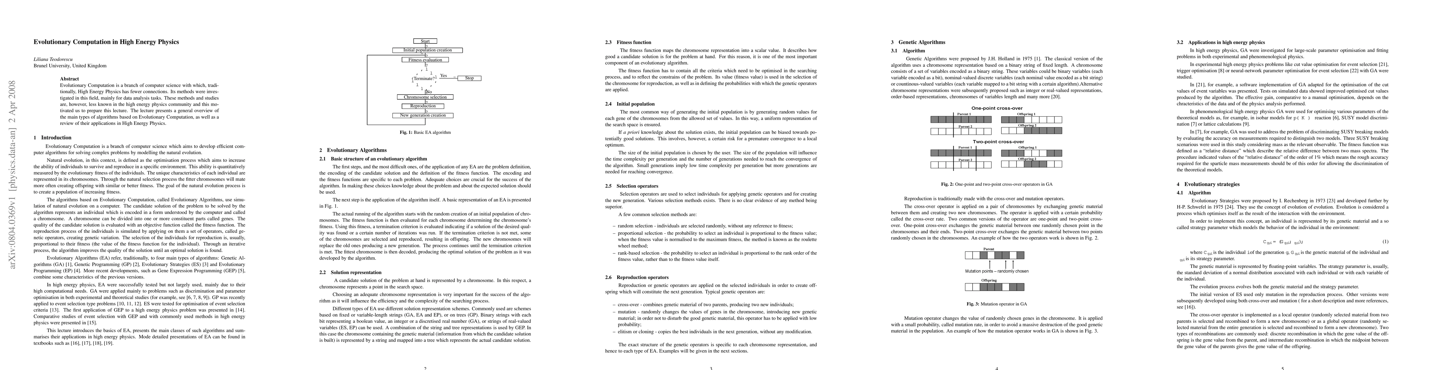 Evolutionary Computation is a branch of computer science with which, traditionally, High Energy Physics has fewer connections. Its methods were investigated in this field, mainly for data analysis tasks. These methods and studies are, however, less known in the high energy physics community and this motivated us to prepare this lecture. The lecture presents a general overview of the main types of algorithms based on Evolutionary Computation, as well as a review of their applications in High Energy Physics.