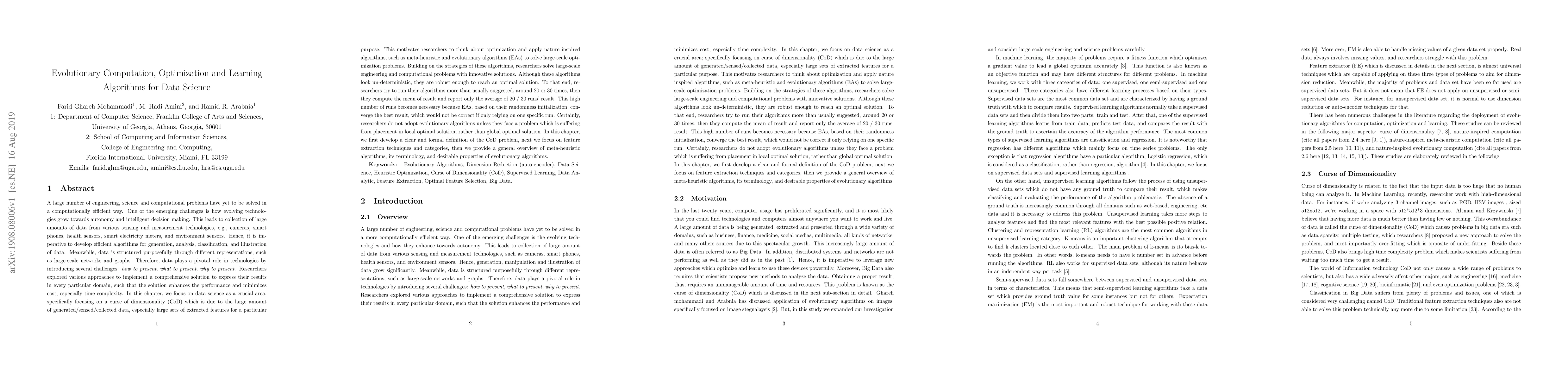 This paper explores the application of evolutionary computation, optimization, and learning algorithms to address data science challenges, particularly the curse of dimensionality. It emphasizes the use of nature-inspired algorithms like evolutionary algorithms to efficiently solve complex optimization problems arising from large data sets.