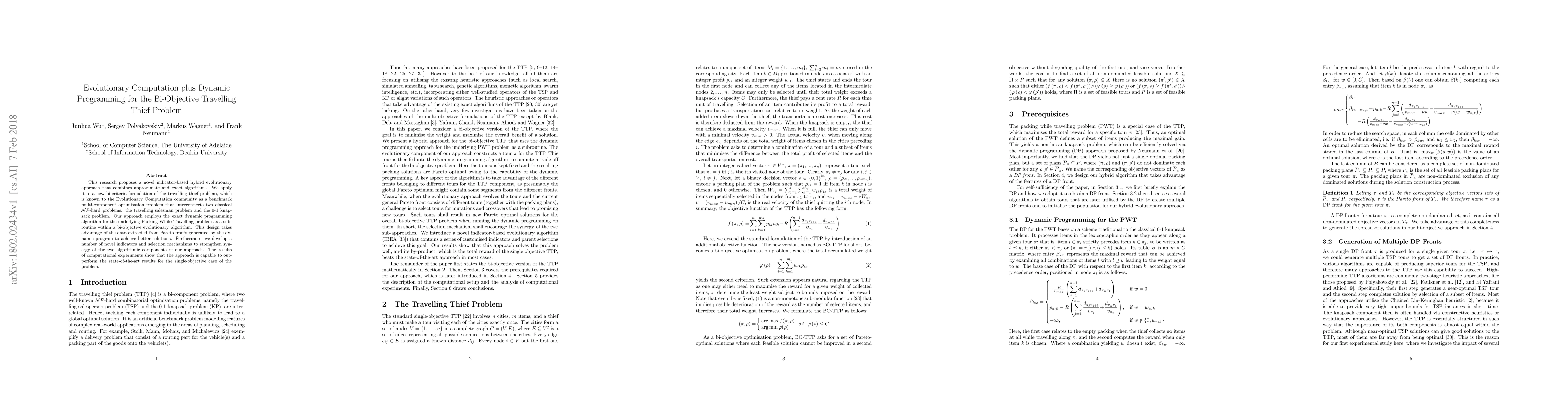 This research introduces a hybrid evolutionary algorithm combining approximate and exact methods to tackle a bi-objective version of the Travelling Thief Problem. It leverages dynamic programming for the Packing-While-Travelling subproblem, enhancing the evolutionary algorithm with data from Pareto fronts, and achieves superior results compared to existing single-objective approaches.