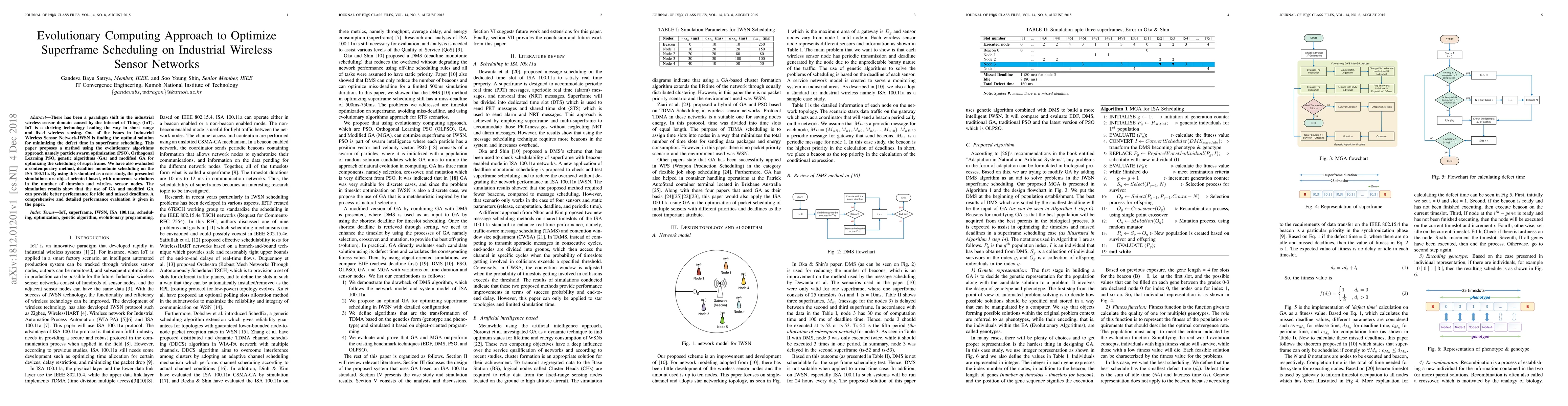 This paper proposes evolutionary computing methods, including particle swarm optimization and genetic algorithms, to optimize superframe scheduling in Industrial Wireless Sensor Networks (IWSN). Simulation results show that genetic algorithms and modified genetic algorithms outperform deadline monotonic scheduling in reducing idle time and missed deadlines.