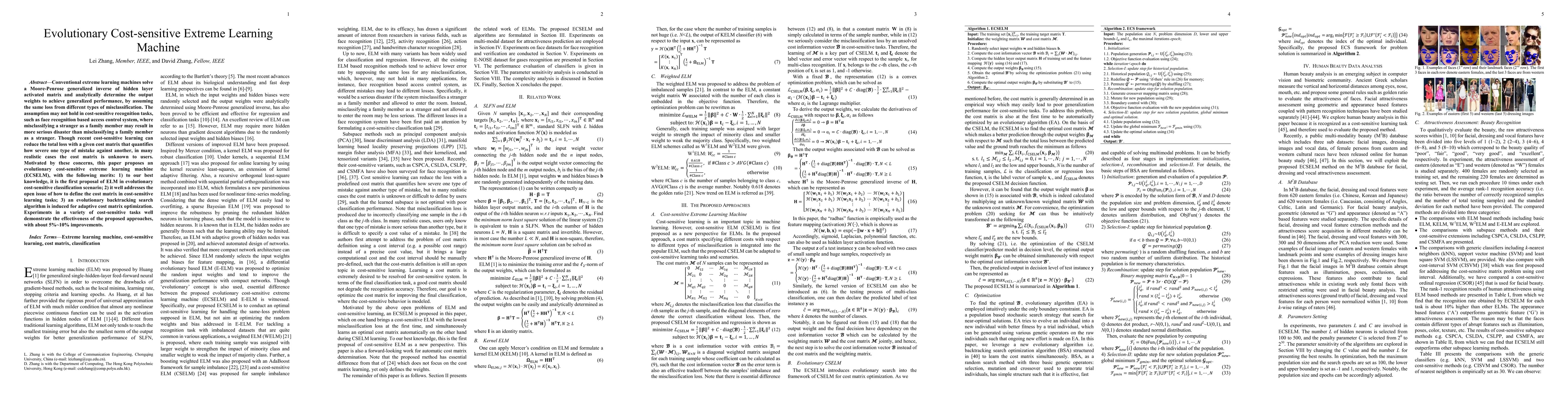 The paper proposes an Evolutionary Cost-sensitive Extreme Learning Machine (ECSELM) to address cost-sensitive classification tasks where different misclassifications have varying consequences. It introduces an adaptive cost matrix optimization method using evolutionary algorithms, demonstrating improved performance in various cost-sensitive tasks.