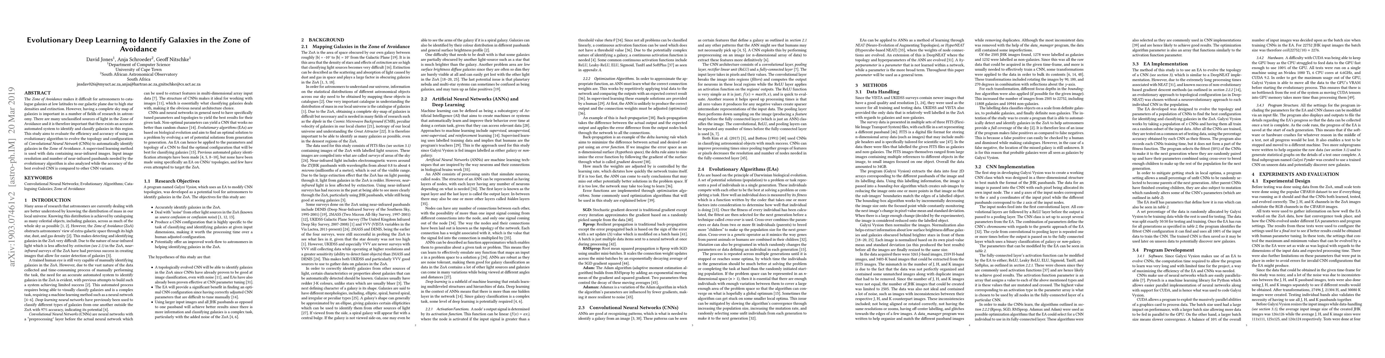 The Zone of Avoidance makes it difficult for astronomers to catalogue galaxies at low latitudes to our galactic plane due to high star densities and extinction. However, having a complete sky map of galaxies is important in a number of fields of research in astronomy. There are many unclassified sources of light in the Zone of Avoidance and it is therefore important that there exists an accurate automated system to identify and classify galaxies in this region. This study aims to evaluate the efficiency and accuracy of using an evolutionary algorithm to evolve the topology and configuration of Convolutional Neural Network (CNNs) to automatically identify galaxies in the Zone of Avoidance. A supervised learning method is used with data containing near-infrared images. Input image resolution and number of near-infrared passbands needed by the evolutionary algorithm is also analyzed while the accuracy of the best evolved CNN is compared to other CNN variants.