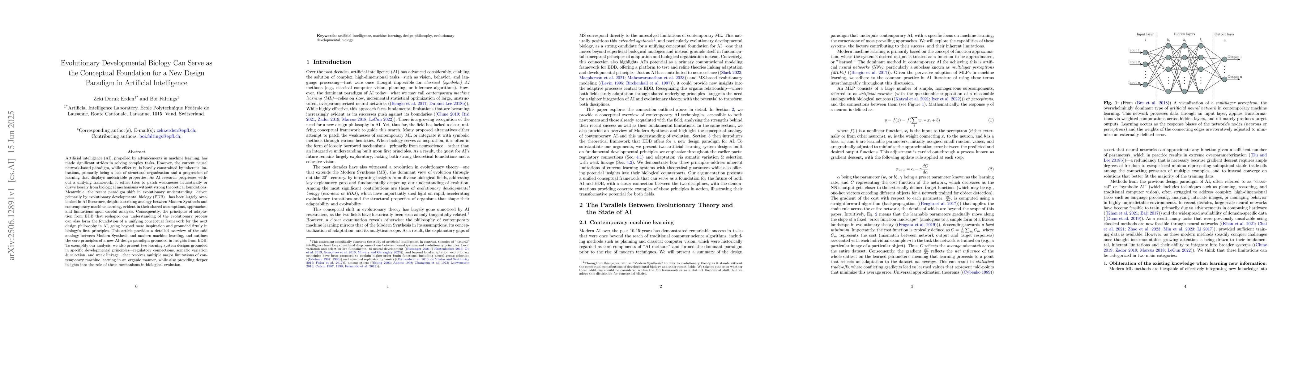 Artificial intelligence (AI), propelled by advancements in machine learning, has made significant strides in solving complex tasks. However, the current neural network-based paradigm, while effective, is heavily constrained by inherent limitations, primarily a lack of structural organization and a progression of learning that displays undesirable properties. As AI research progresses without a unifying framework, it either tries to patch weaknesses heuristically or draws loosely from biological mechanisms without strong theoretical foundations. Meanwhile, the recent paradigm shift in evolutionary understanding -- driven primarily by evolutionary developmental biology (EDB) -- has been largely overlooked in AI literature, despite a striking analogy between the Modern Synthesis and contemporary machine learning, evident in their shared assumptions, approaches, and limitations upon careful analysis. Consequently, the principles of adaptation from EDB that reshaped our understanding of the evolutionary process can also form the foundation of a unifying conceptual framework for the next design philosophy in AI, going beyond mere inspiration and grounded firmly in biology's first principles. This article provides a detailed overview of the analogy between the Modern Synthesis and modern machine learning, and outlines the core principles of a new AI design paradigm based on insights from EDB. To exemplify our analysis, we also present two learning system designs grounded in specific developmental principles -- regulatory connections, somatic variation and selection, and weak linkage -- that resolve multiple major limitations of contemporary machine learning in an organic manner, while also providing deeper insights into the role of these mechanisms in biological evolution.
