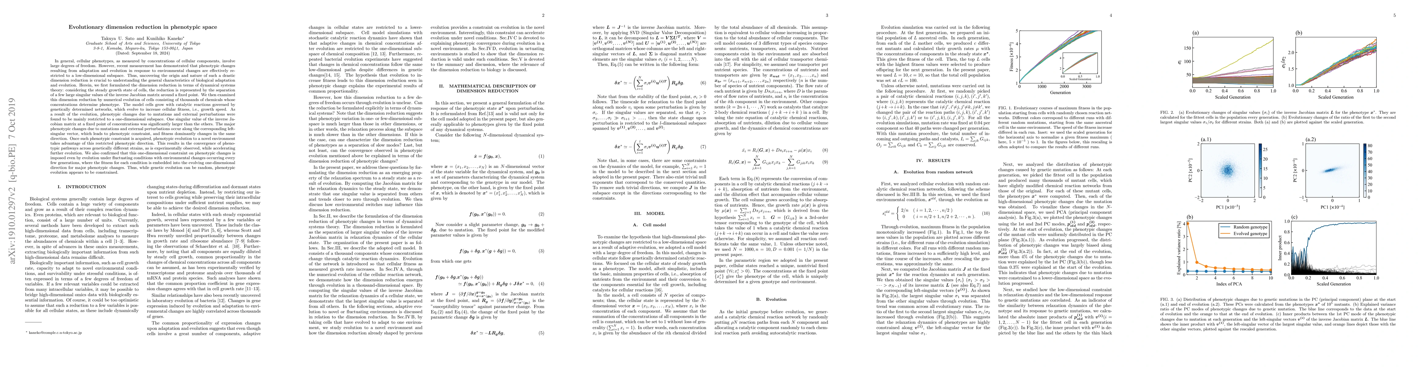 In general, cellular phenotypes, as measured by concentrations of cellular components, involve large degrees of freedom. However, recent measurement has demonstrated that phenotypic changes resulting from adaptation and evolution in response to environmental changes are effectively restricted to a low-dimensional subspace. Thus, uncovering the origin and nature of such a drastic dimension reduction is crucial to understanding the general characteristics of biological adaptation and evolution. Herein, we first formulated the dimension reduction in terms of dynamical systems theory: considering the steady growth state of cells, the reduction is represented by the separation of a few large singular values of the inverse Jacobian matrix around a fixed point. We then examined this dimension reduction by numerical evolution of cells consisting of thousands of chemicals whose concentrations determine phenotype. As a result of the evolution, phenotypic changes due to mutations and external perturbations were found to be mainly restricted to a one-dimensional subspace. One singular value of the inverse Jacobian matrix at a fixed point of concentrations was significantly larger than the others. The major phenotypic changes due to mutations and external perturbations occur along the corresponding left-singular vector, which leads to phenotypic constraint, and fitness dominantly changes in the same direction. Once such phenotypic constraint is acquired, phenotypic evolution to a novel environment takes advantage of this restricted phenotypic direction. This results in the convergence of phenotypic pathways across genetically different strains, as is experimentally observed, while accelerating further evolution.