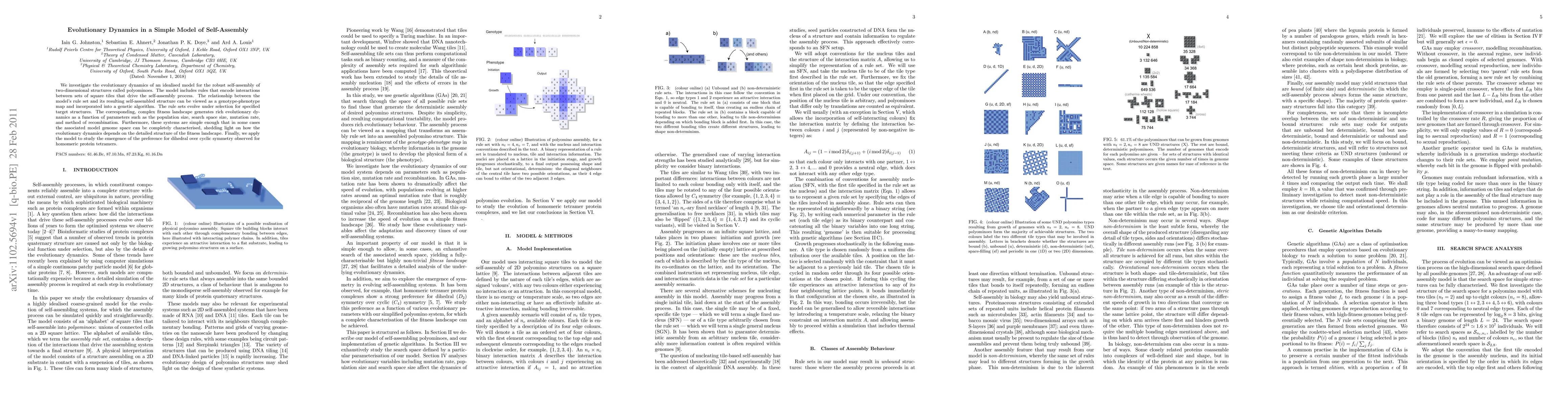 This paper explores the evolutionary dynamics of a simplified self-assembly model for two-dimensional structures called polyominoes, using a genetic algorithm to evolve rule sets that map to target structures. The study reveals complex evolutionary behaviors influenced by parameters like population size and mutation rate, and applies the model to understand the emergence of dihedral symmetry in protein tetramers.