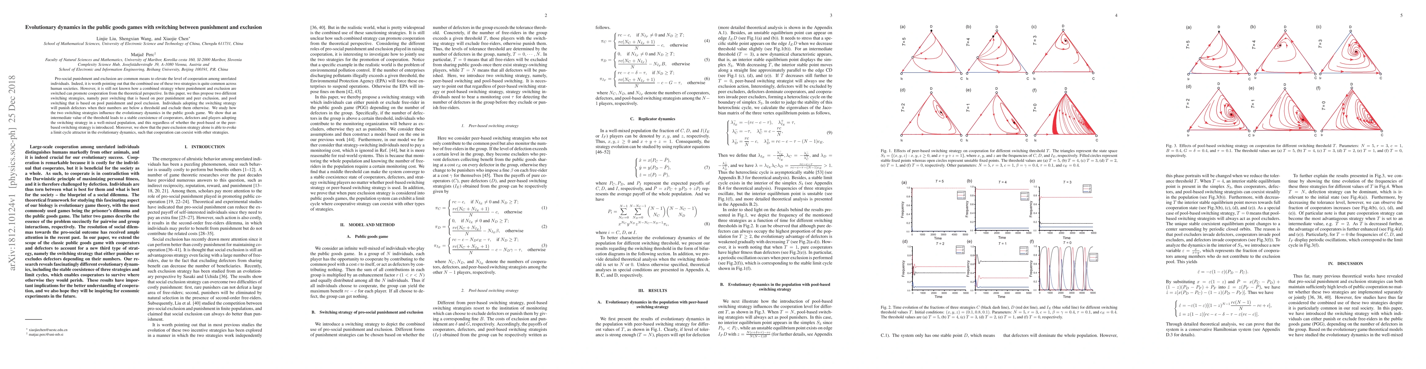 A new study investigates how individuals can cooperate in public goods games by switching between punishment and exclusion, finding that intermediate threshold values lead to stable coexistence of cooperators, defectors, and switchers.