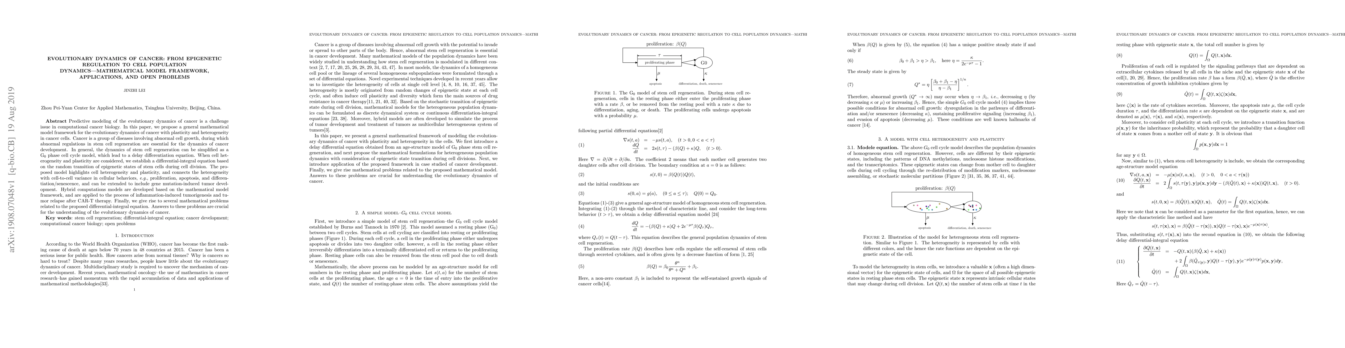 Predictive modeling of the evolutionary dynamics of cancer is a challenge issue in computational cancer biology. In this paper, we propose a general mathematical model framework for the evolutionary dynamics of cancer with plasticity and heterogeneity in cancer cells. Cancer is a group of diseases involving abnormal cell growth, during which abnormal regulations in stem cell regeneration are essential for the dynamics of cancer development. In general, the dynamics of stem cell regeneration can be simplified as a $\mathrm{G_0}$ phase cell cycle model, which lead to a delay differentiation equation. When cell heterogeneity and plasticity are considered, we establish a differential-integral equation based on the random transition of epigenetic states of stem cells during cell division. The proposed model highlights cell heterogeneity and plasticity, and connects the heterogeneity with cell-to-cell variance in cellular behaviors, e.g. proliferation, apoptosis, and differentiation/senescence, and can be extended to include gene mutation-induced tumor development. Hybrid computations models are developed based on the mathematical model framework, and are applied to the process of inflammation-induced tumorigenesis and tumor relapse after CAR-T therapy. Finally, we give rise to several mathematical problems related to the proposed differential-integral equation. Answers to these problems are crucial for the understanding of the evolutionary dynamics of cancer.