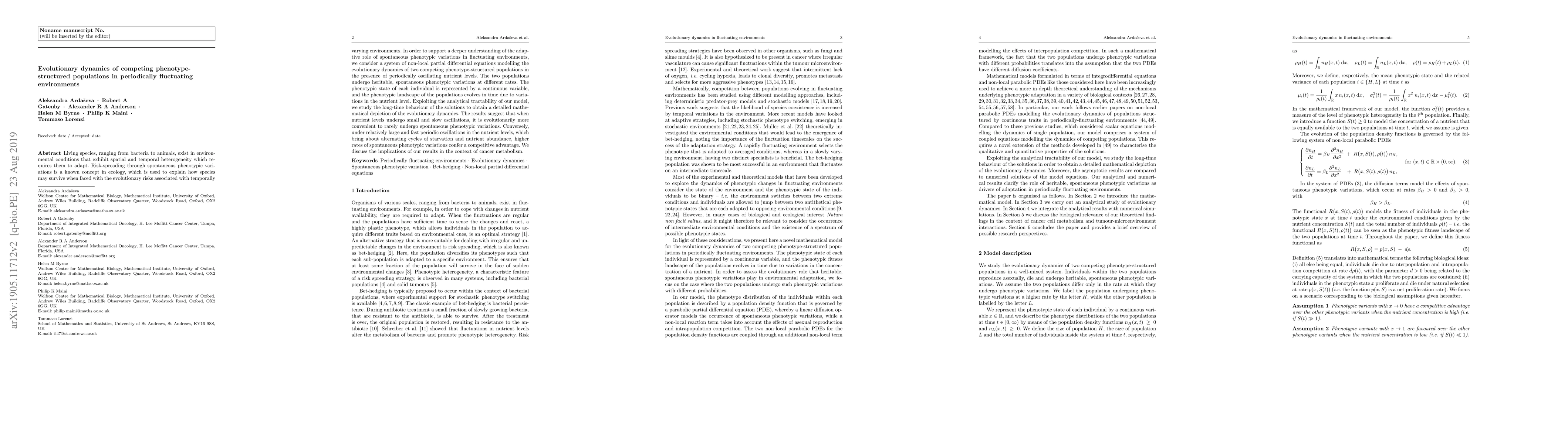 The paper presents a mathematical model for the evolutionary dynamics of two asexual phenotype-structured populations competing in periodically fluctuating environments, using a system of non-local partial differential equations.