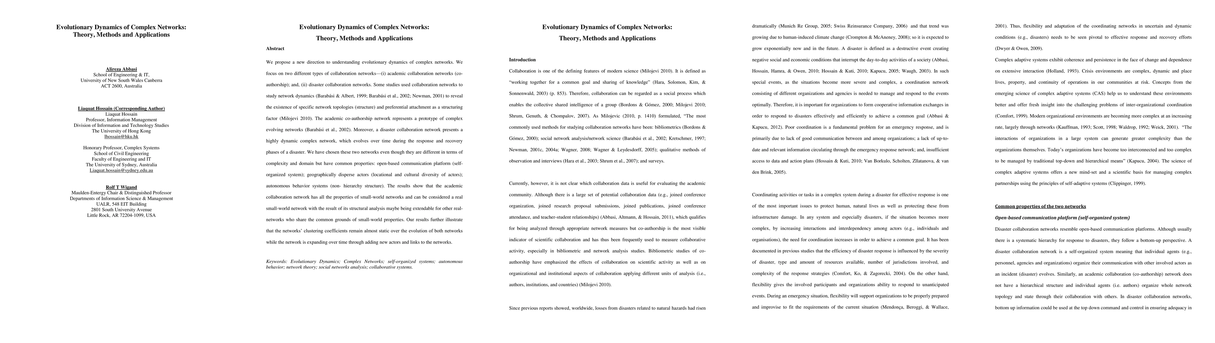 We propose new direction to understanding evolutionary dynamics of complex networks using two different types of collaboration networks: academic collaboration networks; and, disaster collaboration networks. The results show that academic collaboration network has all properties of small-world networks and can be considered a real small-world network with the result of its structural analysis maybe being extendable for other real-networks who share the common grounds of small-world properties.