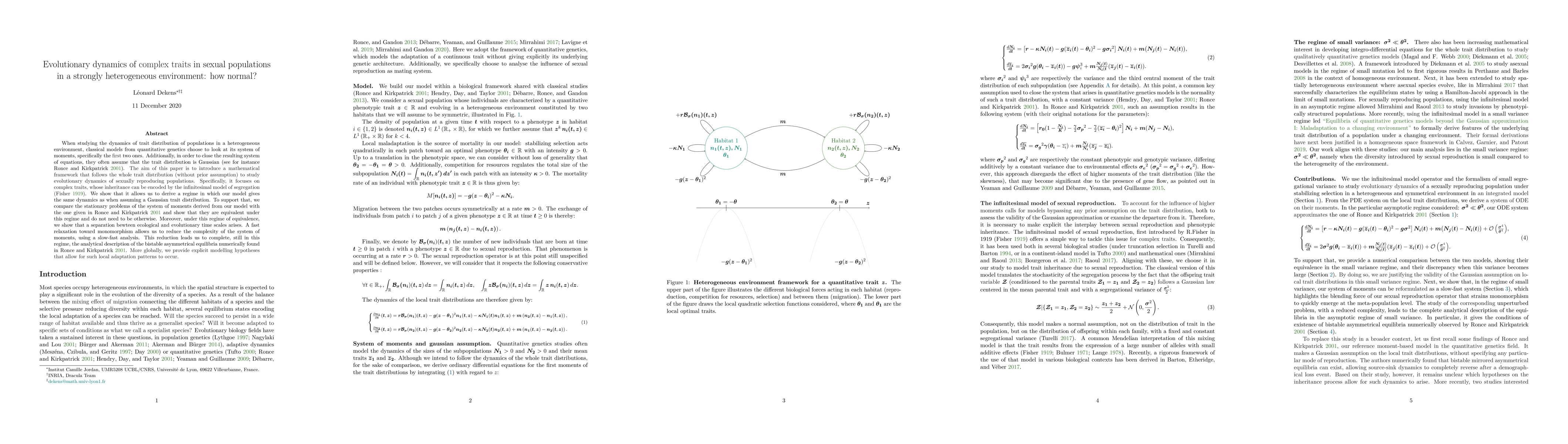 This paper develops a mathematical framework to study the evolutionary dynamics of complex traits in sexually reproducing populations within a heterogeneous environment, without assuming Gaussian trait distribution. It shows equivalence to classical models under certain conditions and provides analytical descriptions of previously found numerical equilibria, highlighting the separation of ecological and evolutionary time scales.