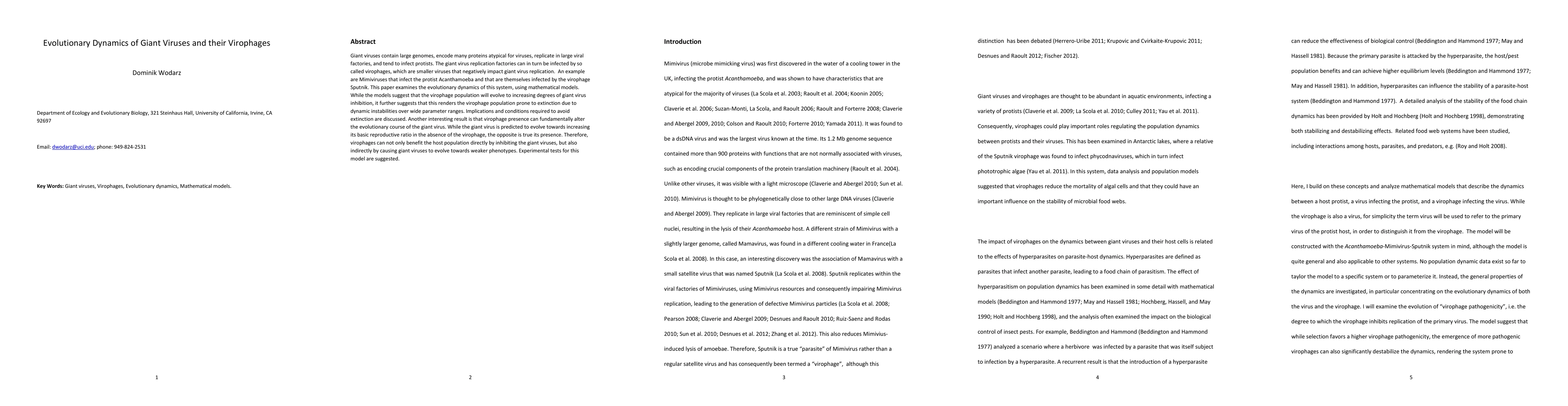Mathematical models suggest that giant viruses may evolve to become weaker due to infection by virophages, which can help control their population, but this could also lead to virophage extinction. The presence of virophages alters the evolutionary course of giant viruses, potentially creating a beneficial dynamic for both species.