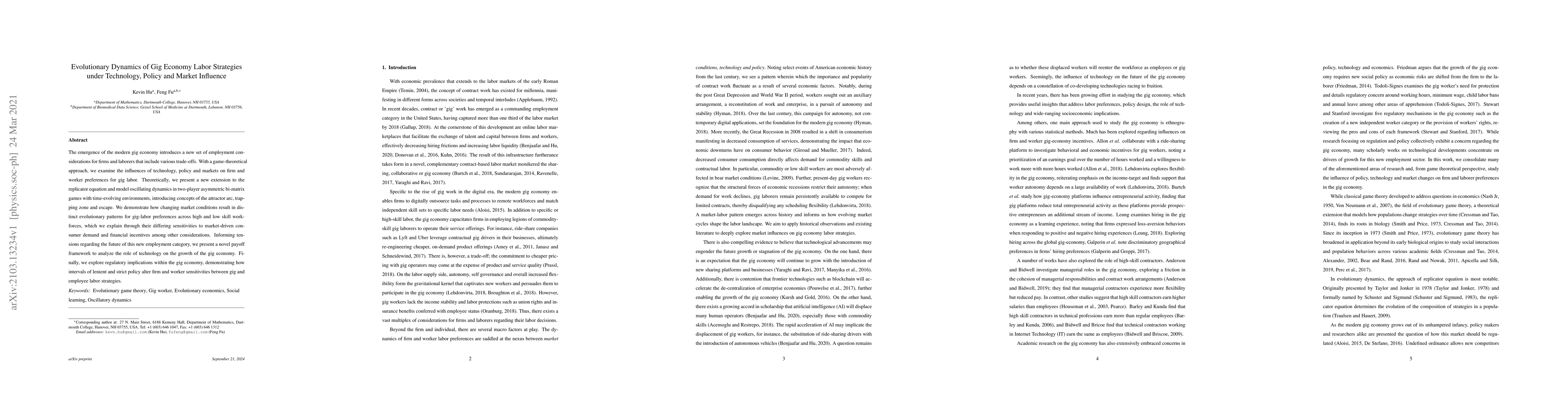 This paper uses game theory to analyze how technology, policy, and market changes influence gig economy labor strategies, introducing new dynamics models and frameworks. It highlights how varying market conditions and regulatory environments affect the preferences of firms and workers in the gig economy, particularly between high and low skill workforces.