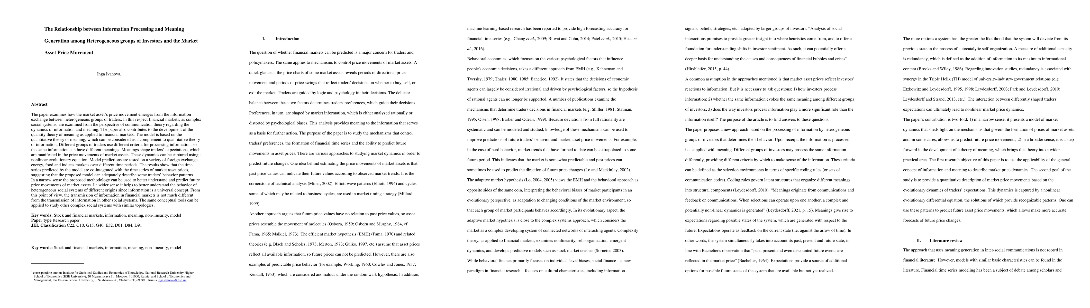 The paper presents a step forward into the development of the theory of meaning. Stock and financial markets are examined from communication-theoretical perspective on the dynamics of information and meaning. This study focuses on the link between the dynamics of investors' expectations and market price movement. The model for market asset price dynamiscs, based on non-linear evolutionary equation linking investors' expectations and market asset price movement, is provided. Model predictions are tested on various FX, energy, food, and indices markets along different time frames. The results suggest that model predicted time series is co-integrated with asset time series which implies that the prop[osed model can be used to forecast future price movement.