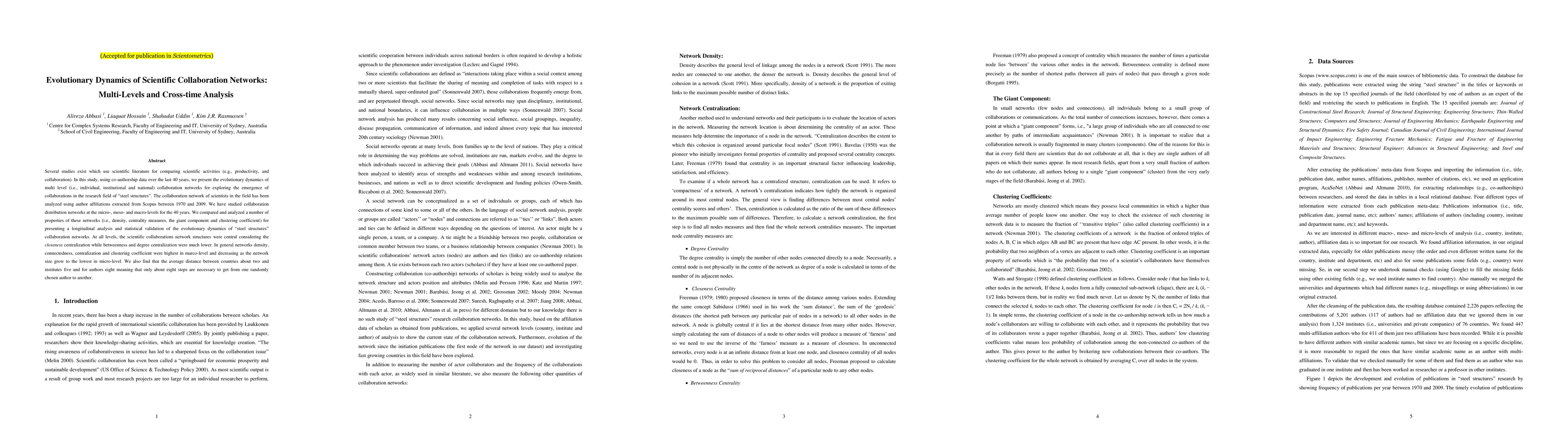 This study analyzes the evolutionary dynamics of scientific collaboration networks in the field of "steel structures" over 40 years, examining multi-level collaboration patterns from individual to national levels. The research reveals that network density and centralization are highest at the macro level, while collaboration networks show a decreasing trend in these properties as network size grows smaller.
