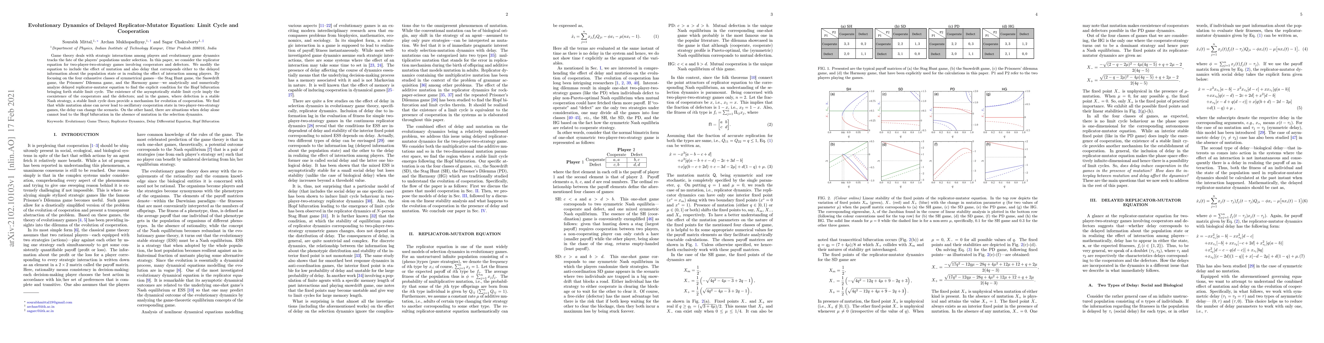 Game theory deals with strategic interactions among players and evolutionary game dynamics tracks the fate of the players' populations under selection. In this paper, we consider the replicator equation for two-player-two-strategy games involving cooperators and defectors. We modify the equation to include the effect of mutation and also delay that corresponds either to the delayed information about the population state or in realizing the effect of interaction among players. By focusing on the four exhaustive classes of symmetrical games -- the Stag Hunt game, the Snowdrift game, the Prisoners' Dilemma game, and the Harmony game -- we analytically and numerically analyze delayed replicator-mutator equation to find the explicit condition for the Hopf bifurcation bringing forth stable limit cycle. The existence of the asymptotically stable limit cycle imply the coexistence of the cooperators and the defectors; and in the games, where defection is a stable Nash strategy, a stable limit cycle does provide a mechanism for evolution of cooperation. We find that while mutation alone can never lead to oscillatory cooperation state in two-player-two-strategy games, the delay can change the scenario. On the other hand, there are situations when delay alone cannot lead to the Hopf bifurcation in the absence of mutation in the selection dynamics.