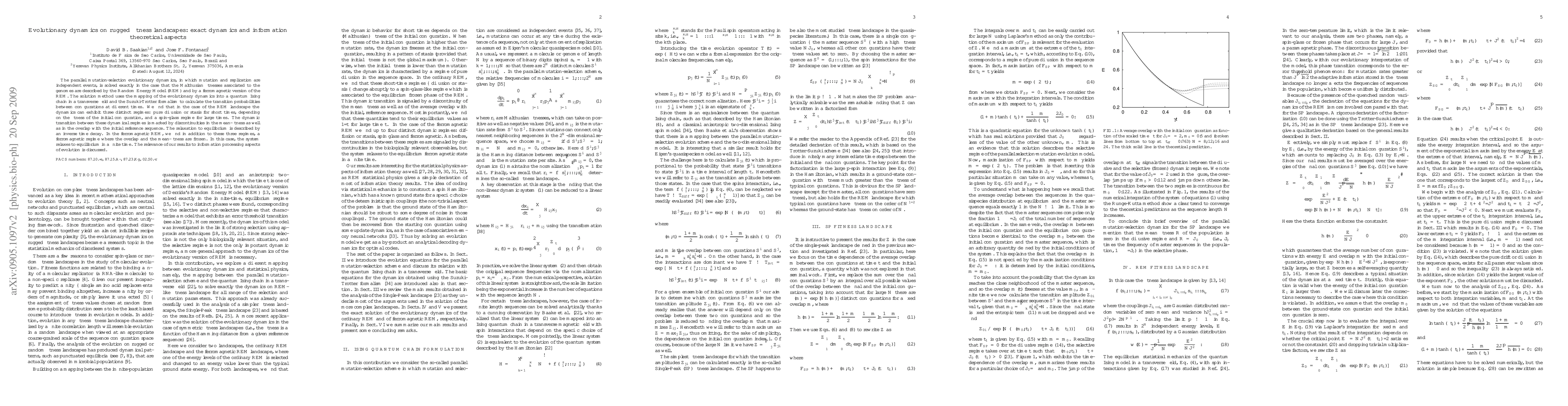 The paper solves exactly the parallel mutation-selection evolutionary dynamics for certain fitness landscapes, revealing three regimes: pure diffusion, stasis, and a spin-glass regime, with different relaxation times to equilibrium.
