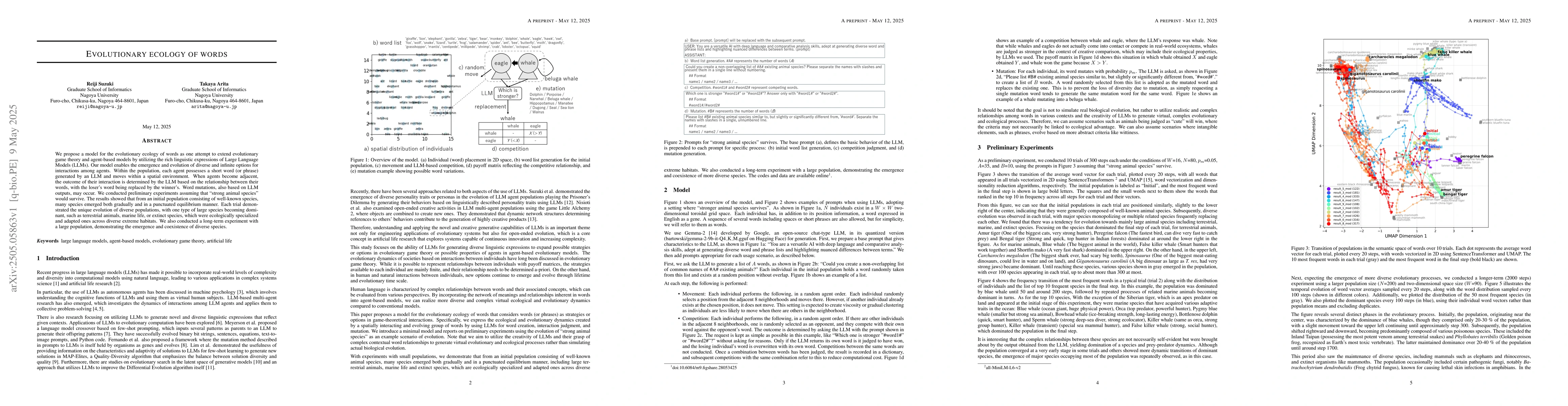 We propose a model for the evolutionary ecology of words as one attempt to extend evolutionary game theory and agent-based models by utilizing the rich linguistic expressions of Large Language Models (LLMs). Our model enables the emergence and evolution of diverse and infinite options for interactions among agents. Within the population, each agent possesses a short word (or phrase) generated by an LLM and moves within a spatial environment. When agents become adjacent, the outcome of their interaction is determined by the LLM based on the relationship between their words, with the loser's word being replaced by the winner's. Word mutations, also based on LLM outputs, may occur. We conducted preliminary experiments assuming that ``strong animal species" would survive. The results showed that from an initial population consisting of well-known species, many species emerged both gradually and in a punctuated equilibrium manner. Each trial demonstrated the unique evolution of diverse populations, with one type of large species becoming dominant, such as terrestrial animals, marine life, or extinct species, which were ecologically specialized and adapted ones across diverse extreme habitats. We also conducted a long-term experiment with a large population, demonstrating the emergence and coexistence of diverse species.